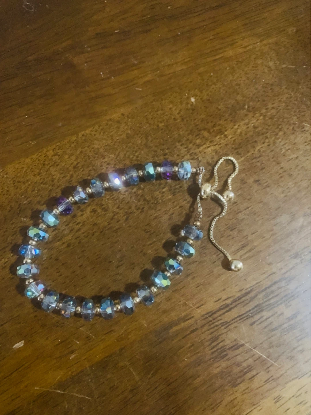 Sparkly bolo bracelet with blue and purple faceted beads. It features a sliding clasp for an adjustable fit. This piece adds a nice touch of shimmer to any outfit!