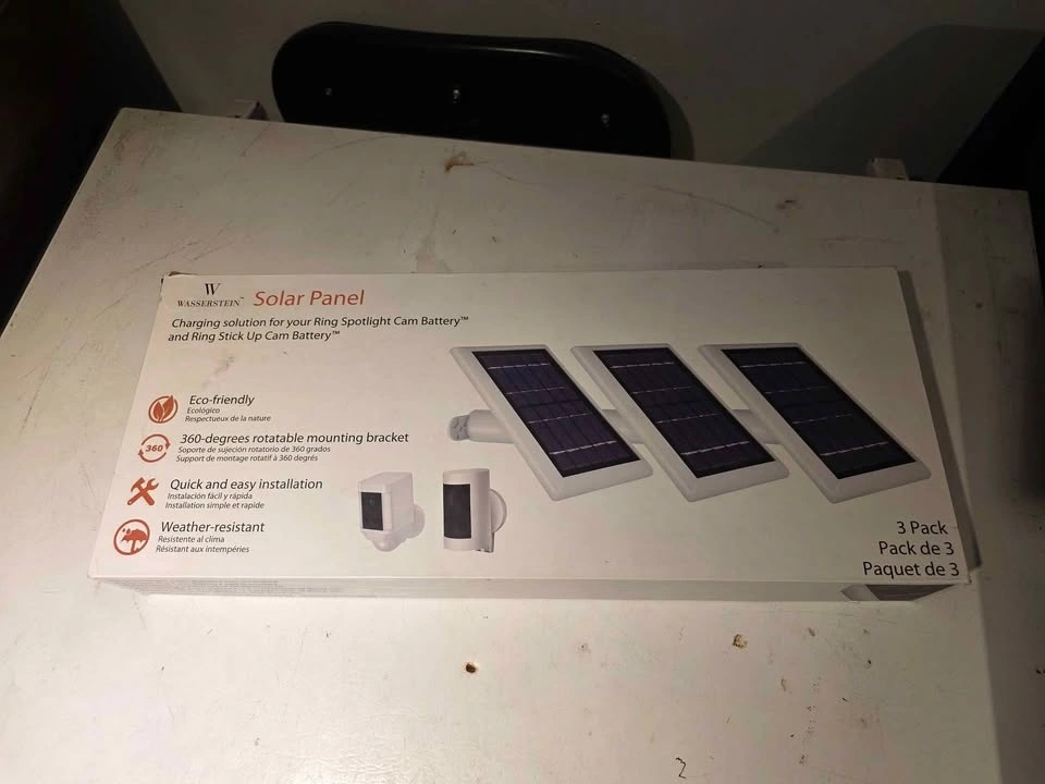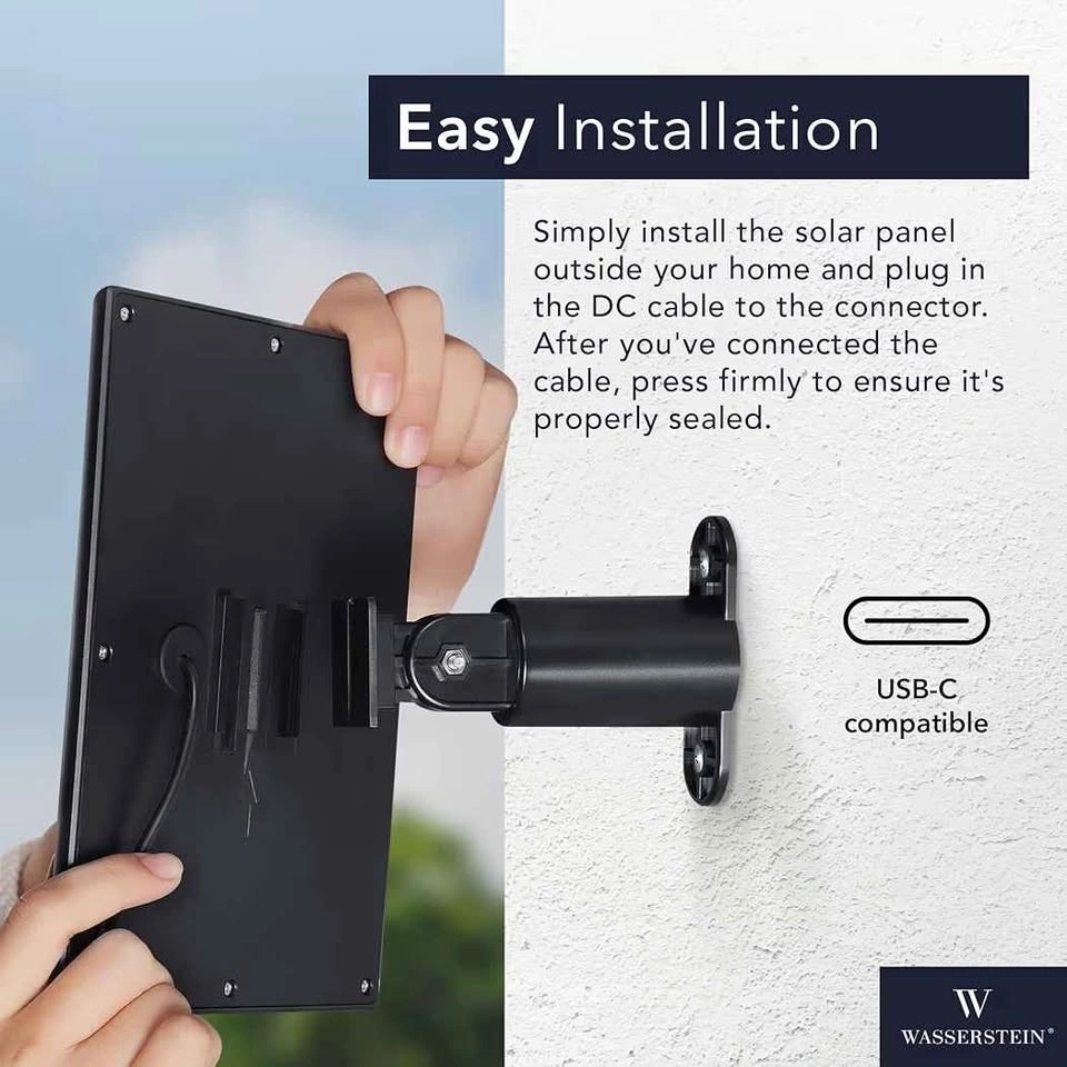 Wasserstein 3-pack solar panels for Ring Spotlight Cam. Battery & other compatible cameras. Features efficient solar cells, 360° adjustable mount, and 4m/13ft cables for easy positioning. Quick installation with included USB-C adapters, mounting brackets, screws, and anchors. Keep your cameras charged reliably with solar power.