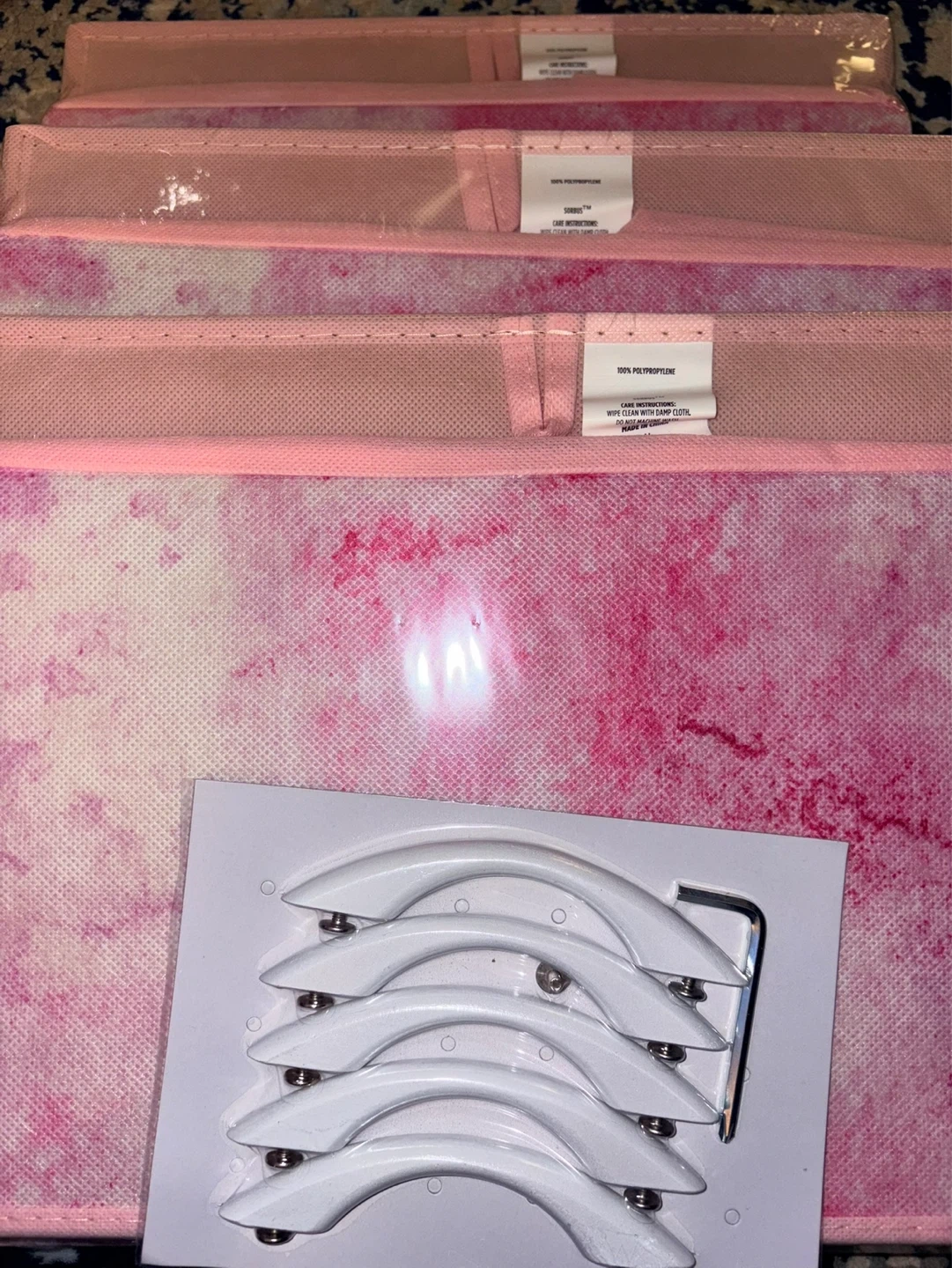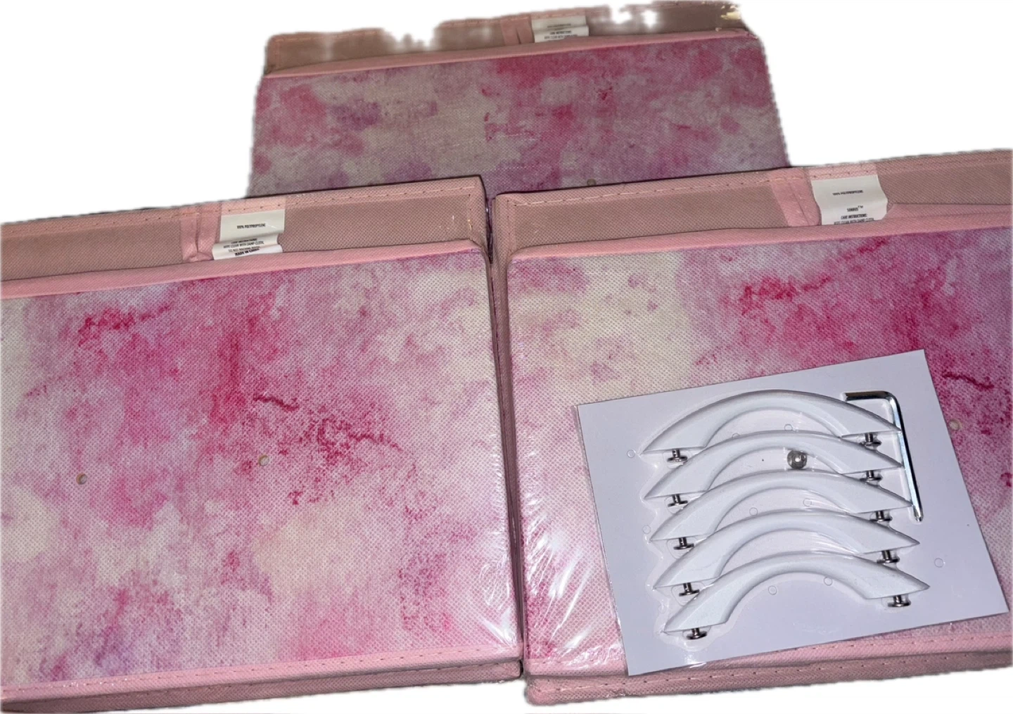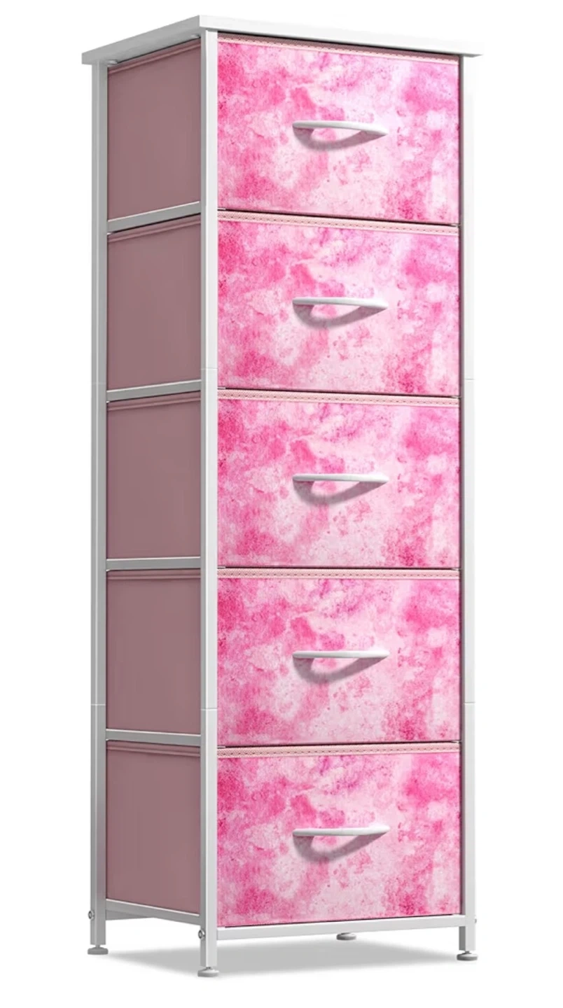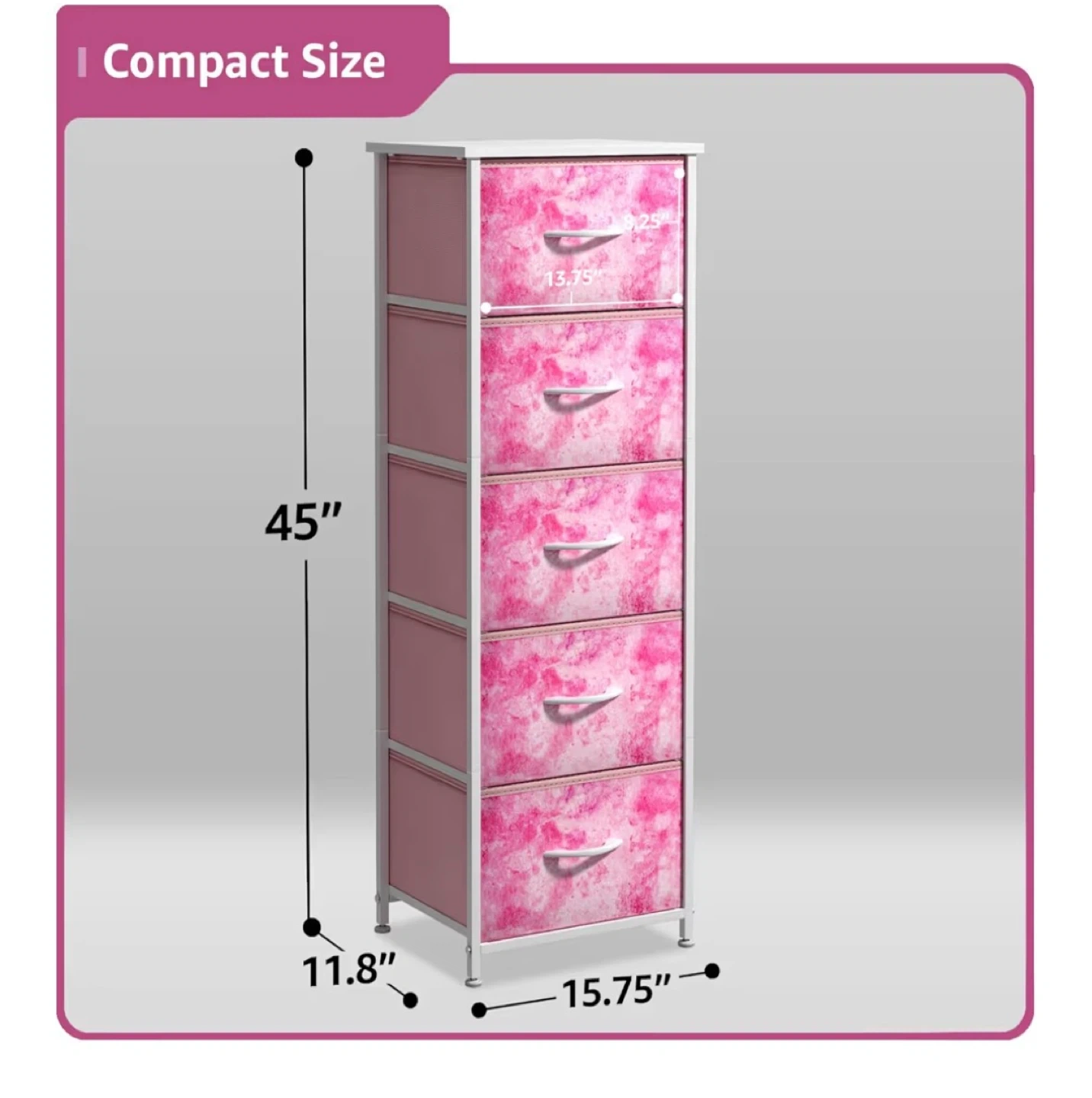 This Sorbus fabric dresser features a vibrant pink marble design. It has a metal frame and comes with five fabric drawers. The dresser measures 45" tall, 15.75" wide, and 11.8" deep. It's great for organizing clothes or toys!