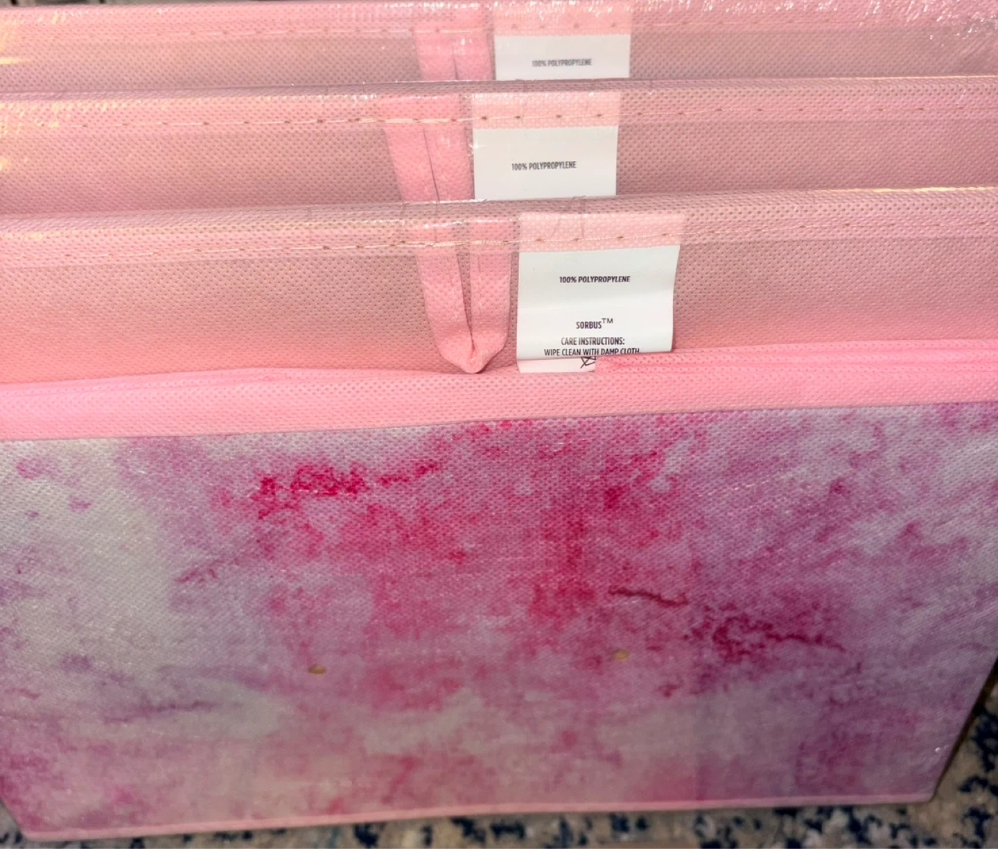 This Sorbus fabric dresser features a vibrant pink marble design. It has a metal frame and comes with five fabric drawers. The dresser measures 45" tall, 15.75" wide, and 11.8" deep. It's great for organizing clothes or toys!