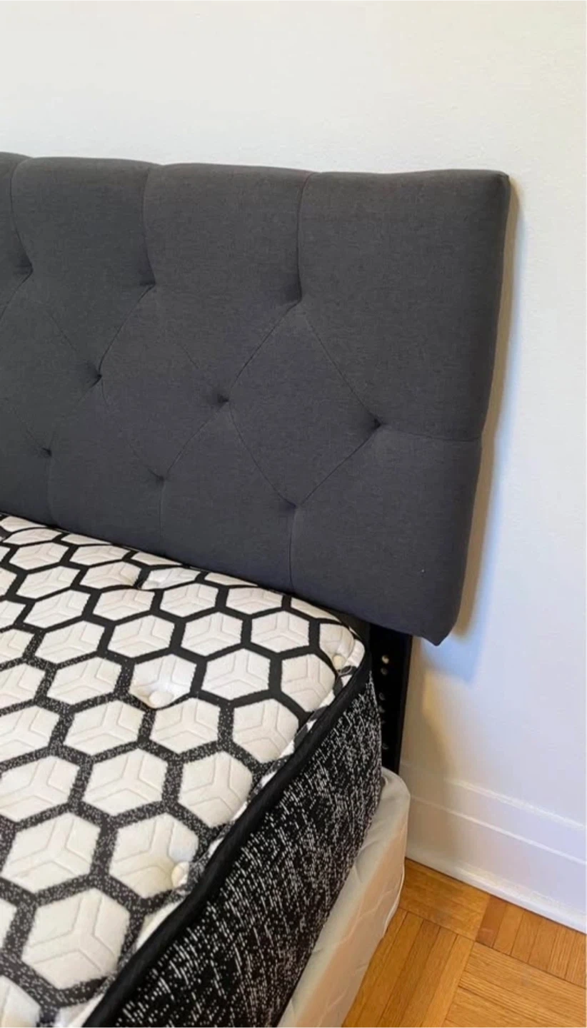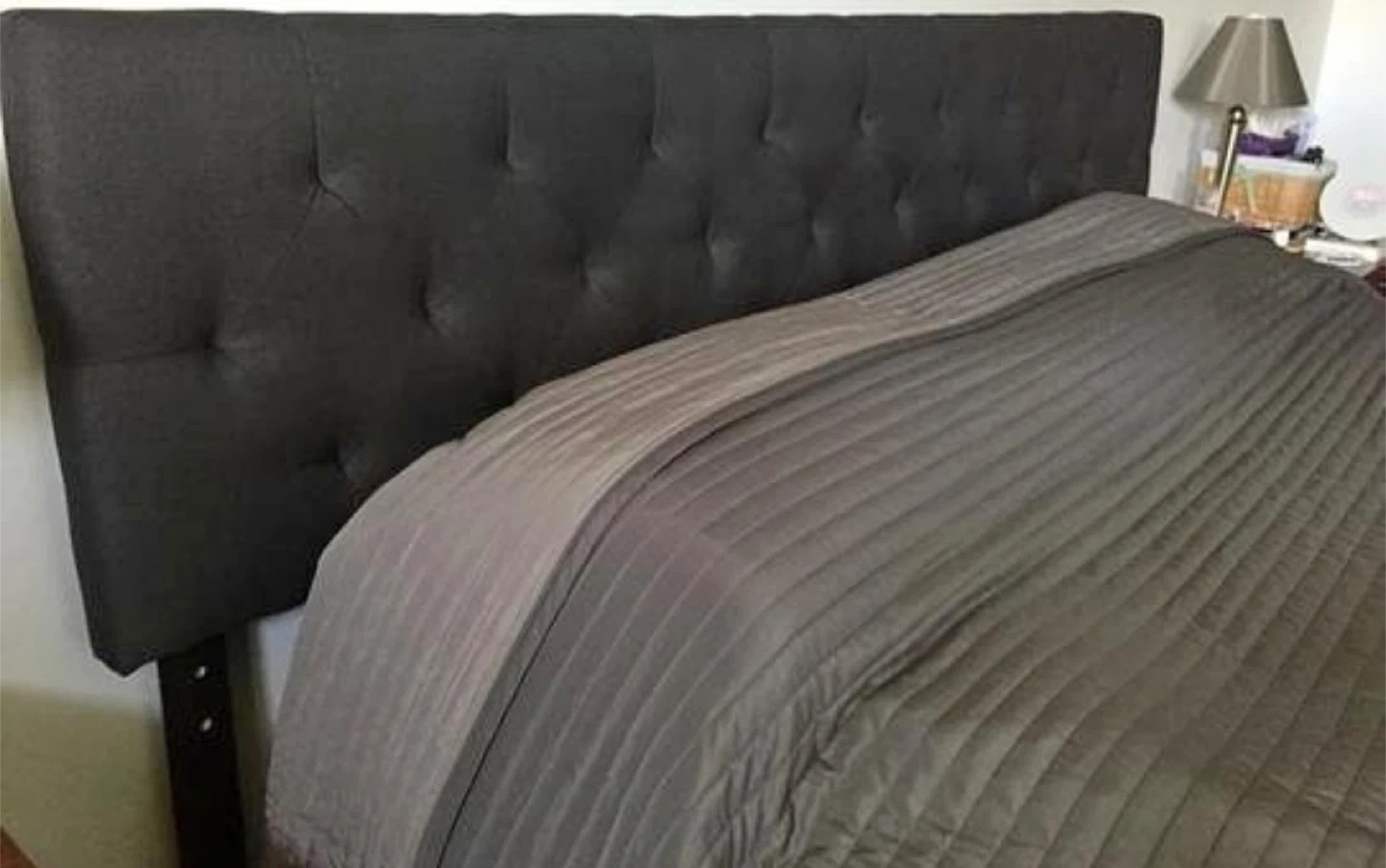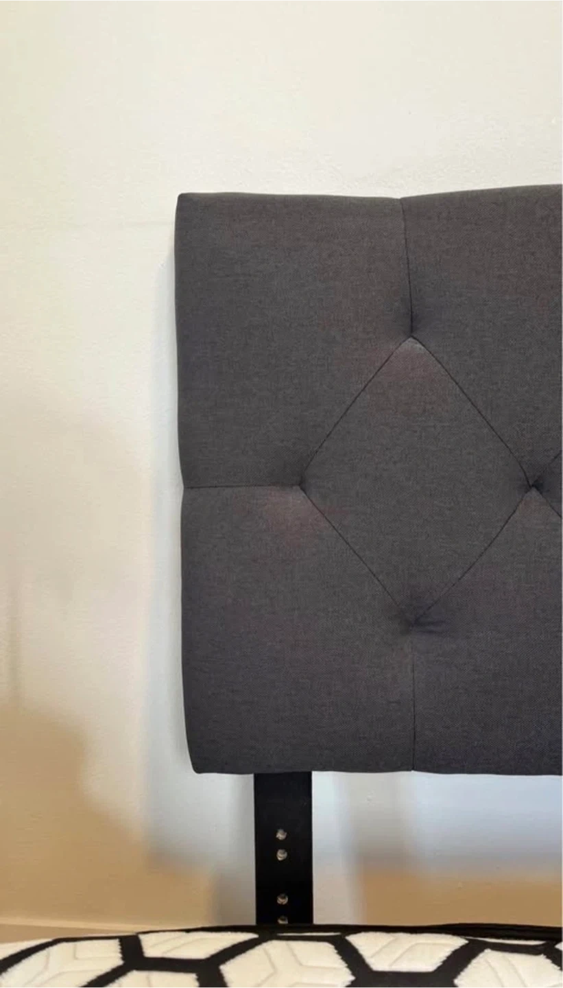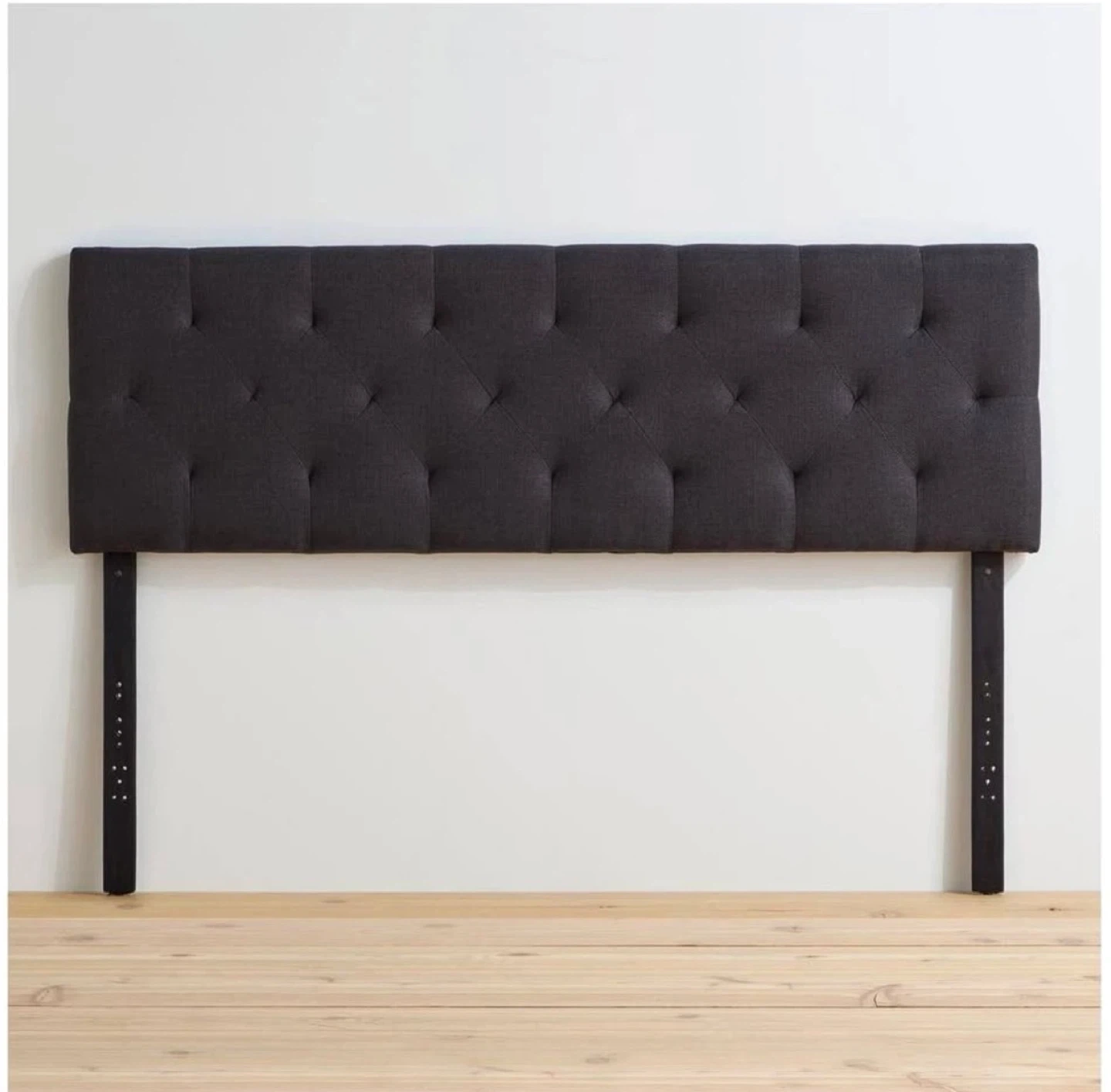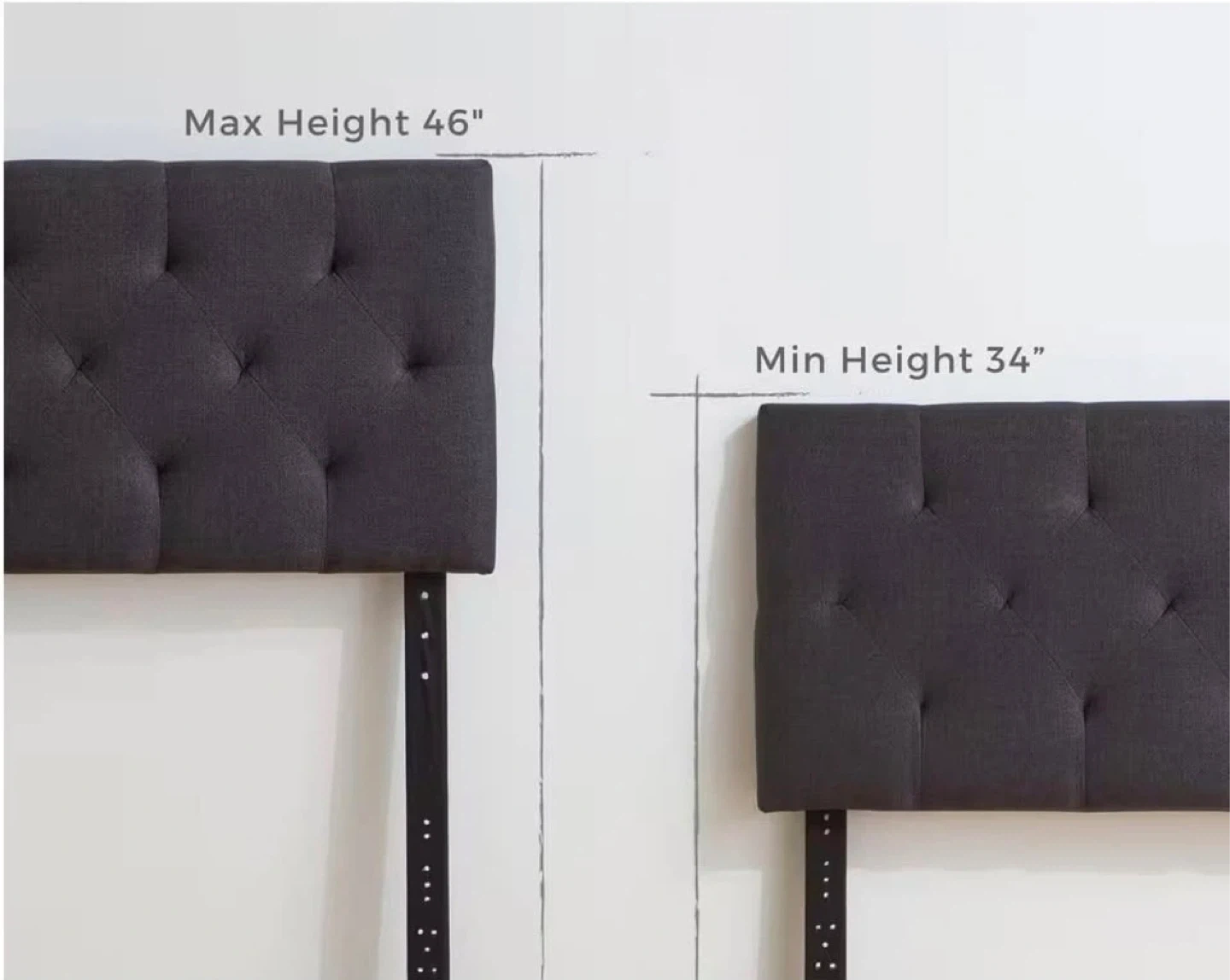 Dark grey upholstered headboard with tufted detailing. Features adjustable height options, with a maximum height of 46" and a minimum height of 34". Fabric material.
