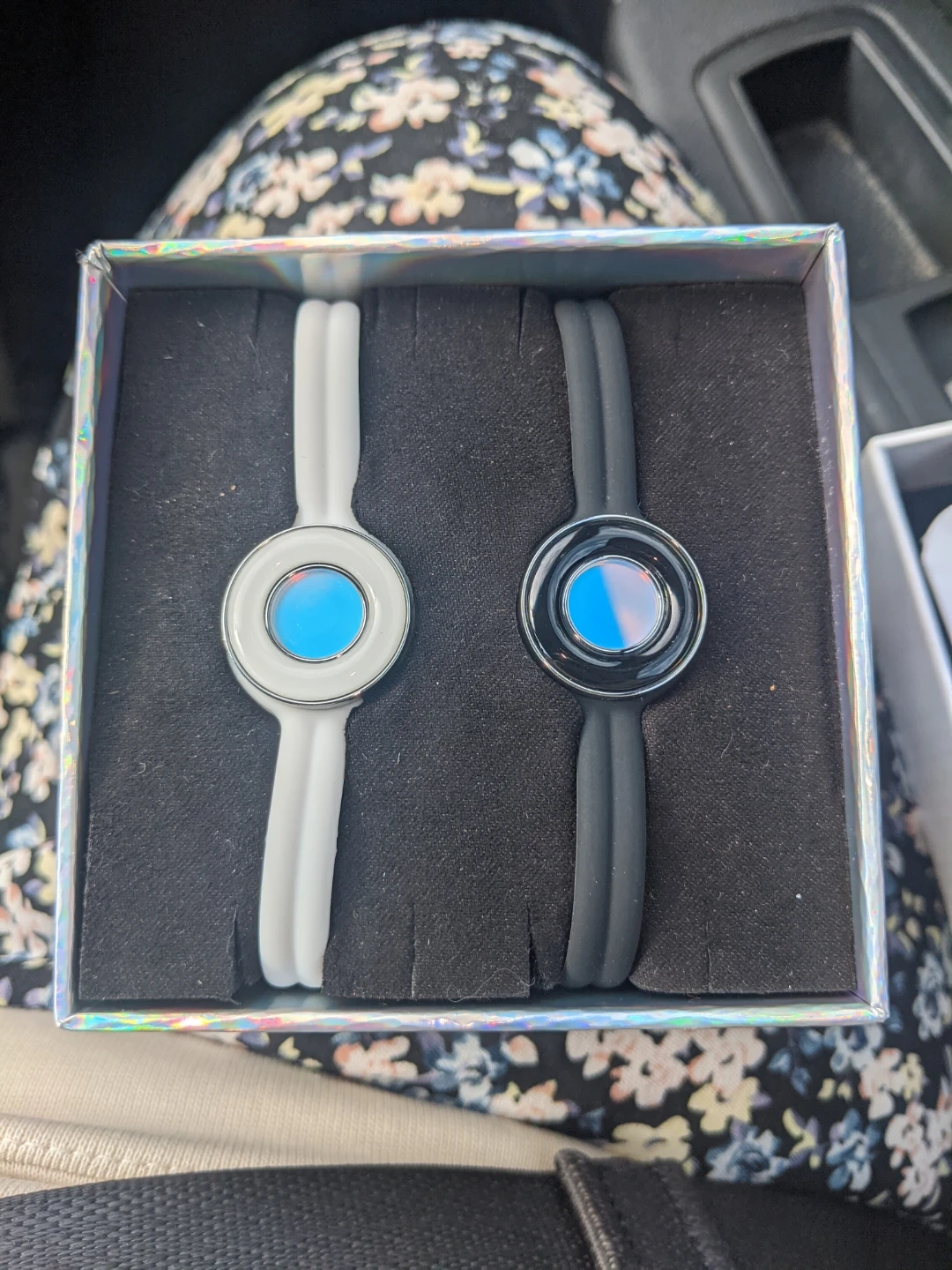 This is a pair of Bond Touch bracelets, one white and one black, designed to keep you connected. Each bracelet comes with its own charging module and includes a quick start guide. They are great for couples to stay in touch when apart!