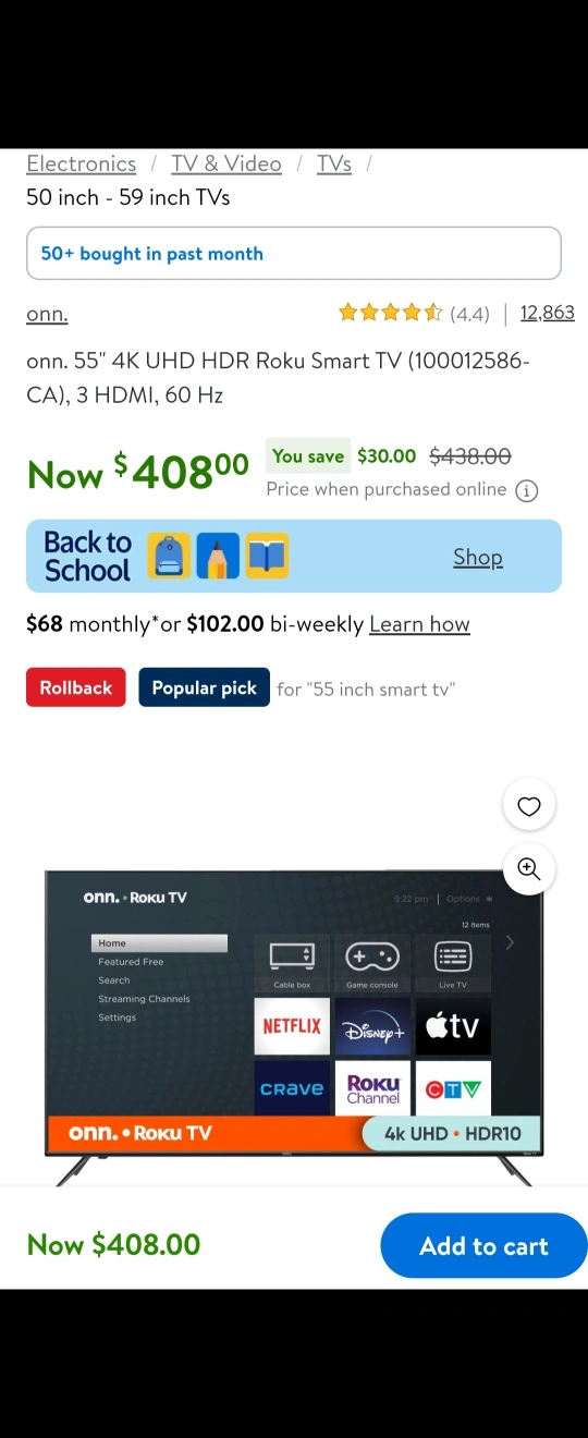 onn. 55" 4K UHD HDR Roku Smart TV (100012586-CA), 3 HDMI, 60 Hz