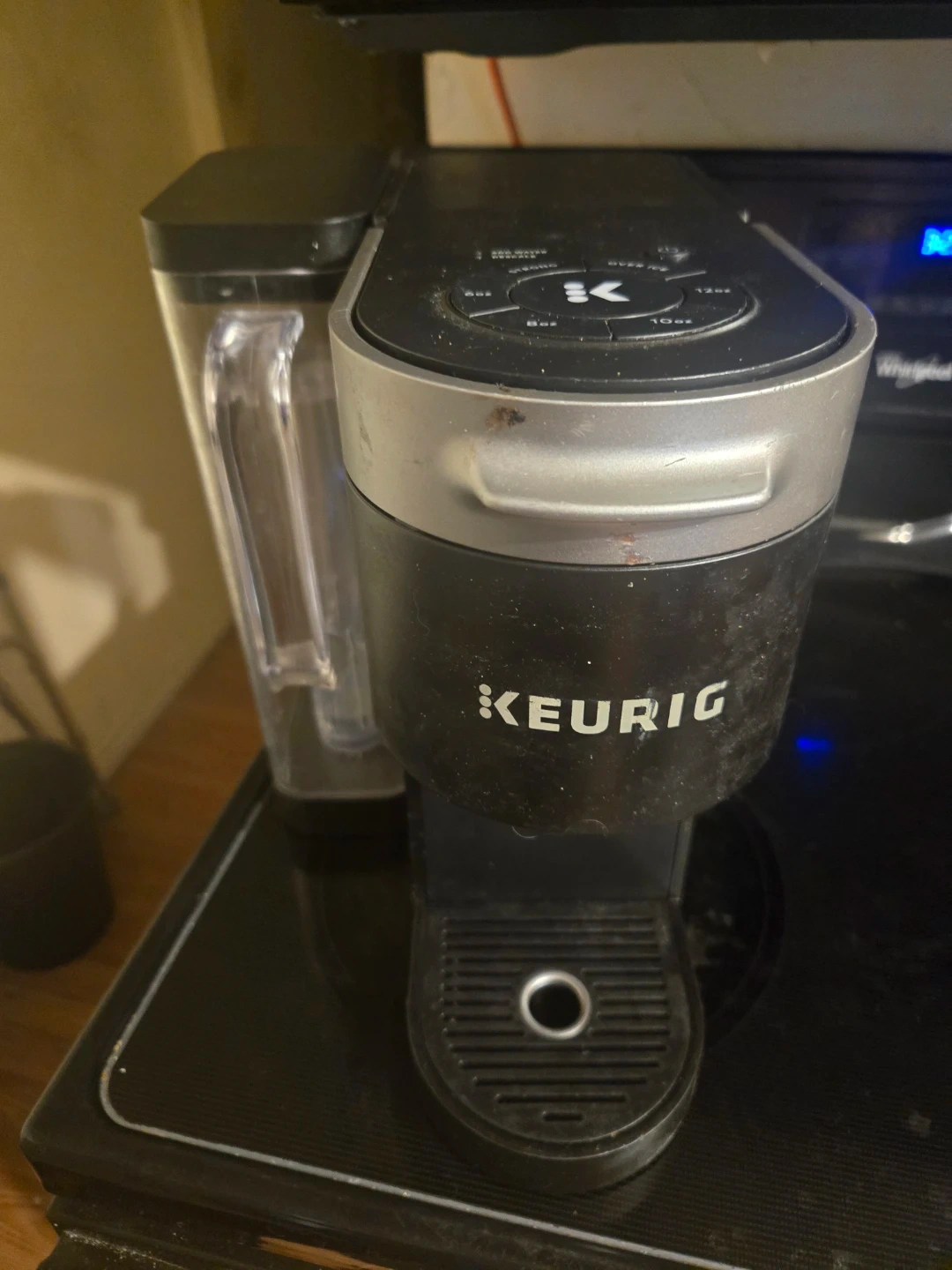 Keurig K-Mini Plus single-serve coffee maker. Brews 6oz, 8oz, 10oz, or 12oz cups. It's compact and great for small spaces. Includes strong brew and over ice options.