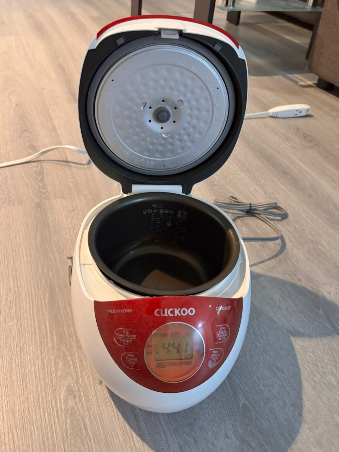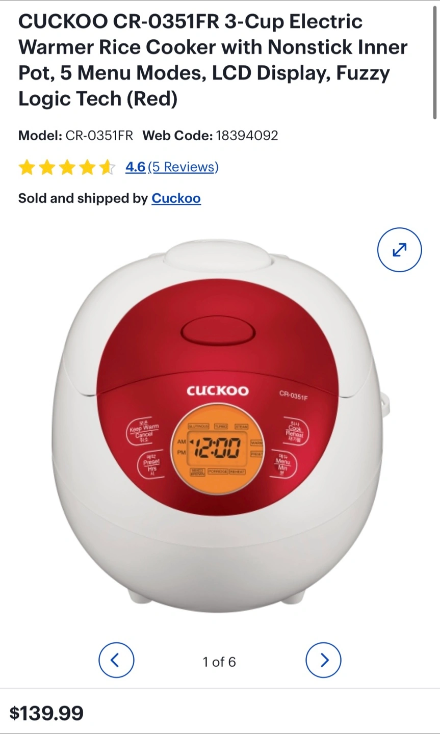 Selling a Cuckoo CR-0351F 3-Cup Electric Warmer Rice Cooker with Nonstick Inner Pot. It has 5 Menu Modes and an LCD Display. The original price was $139.99.