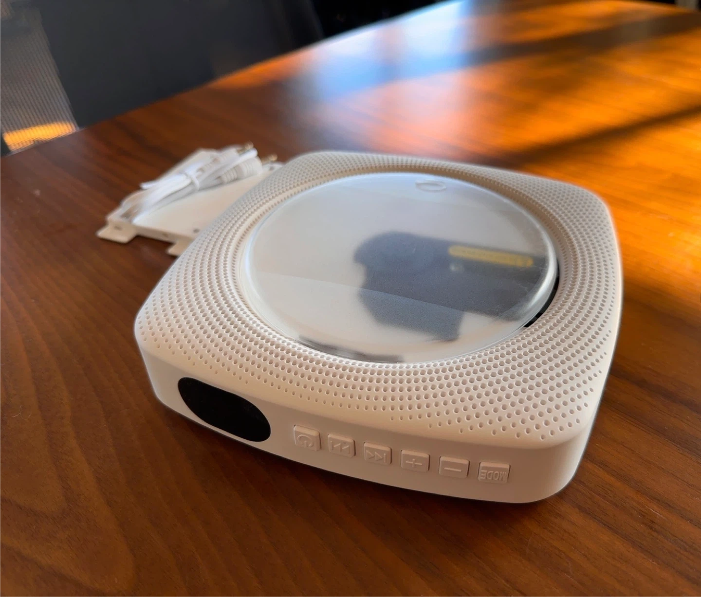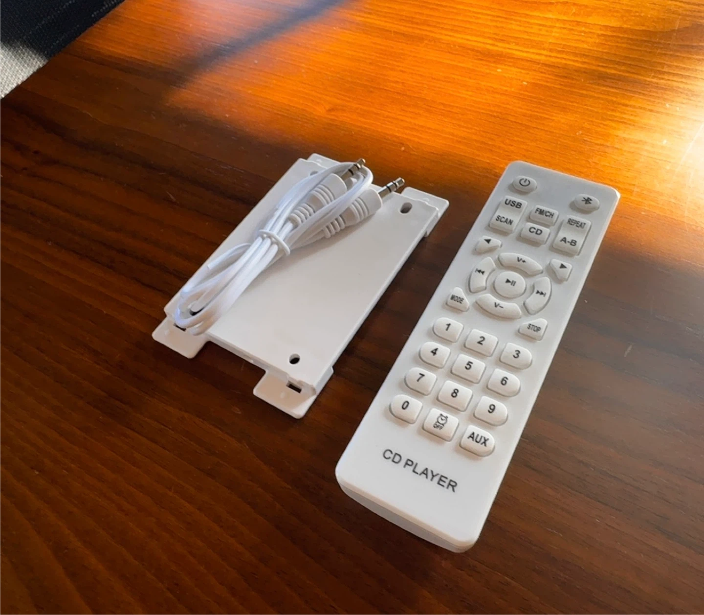 CD player comes with a remote control and accessories. It’s wall mountable, supportsMP3, CD, USB, and AUX input. Also works as a Bluetooth speaker.