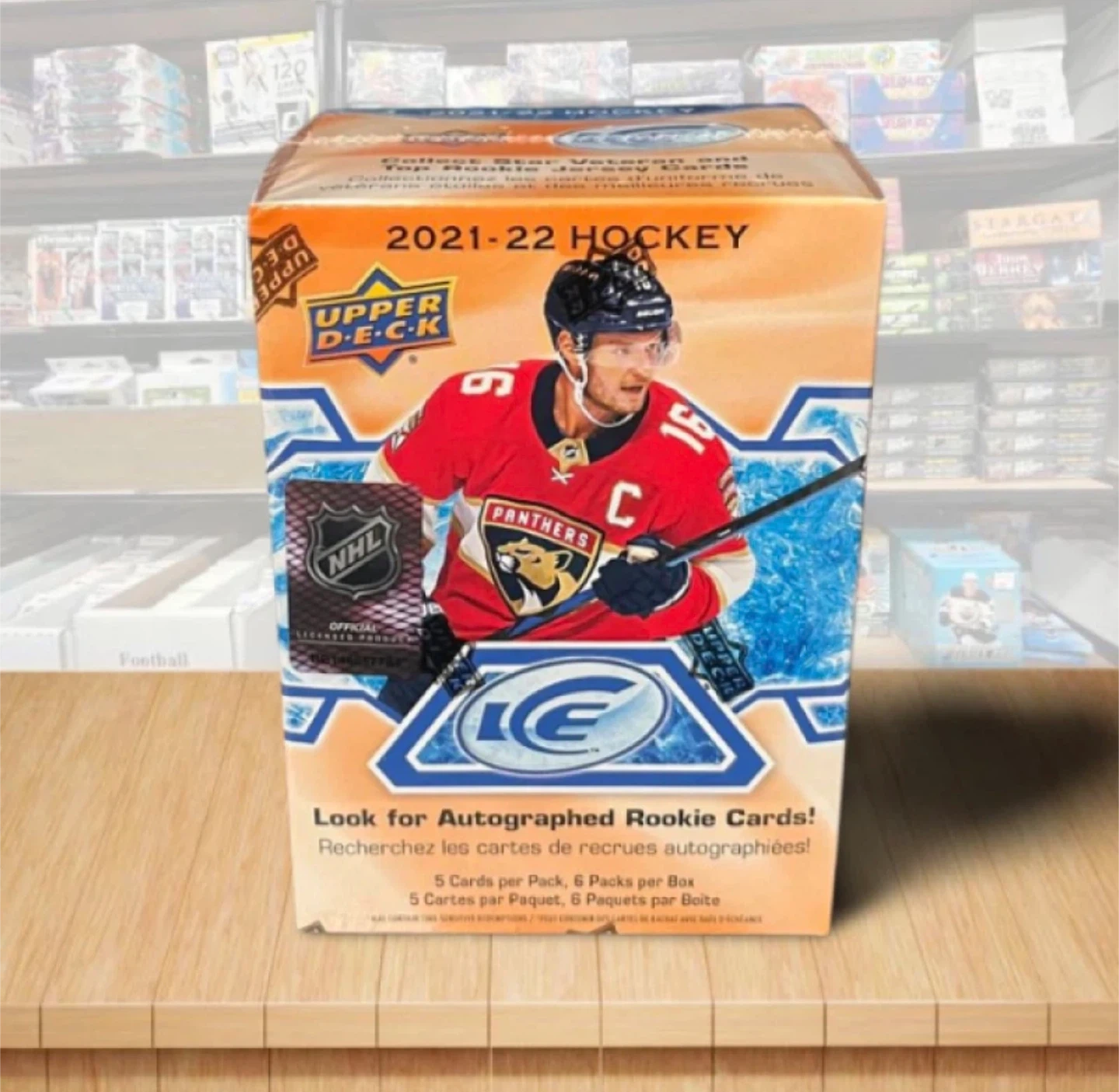 This is a 2021-22 Upper Deck Hockey ICE box. It contains 5 cards per pack and 6 packs per box. Look for autographed rookie cards!