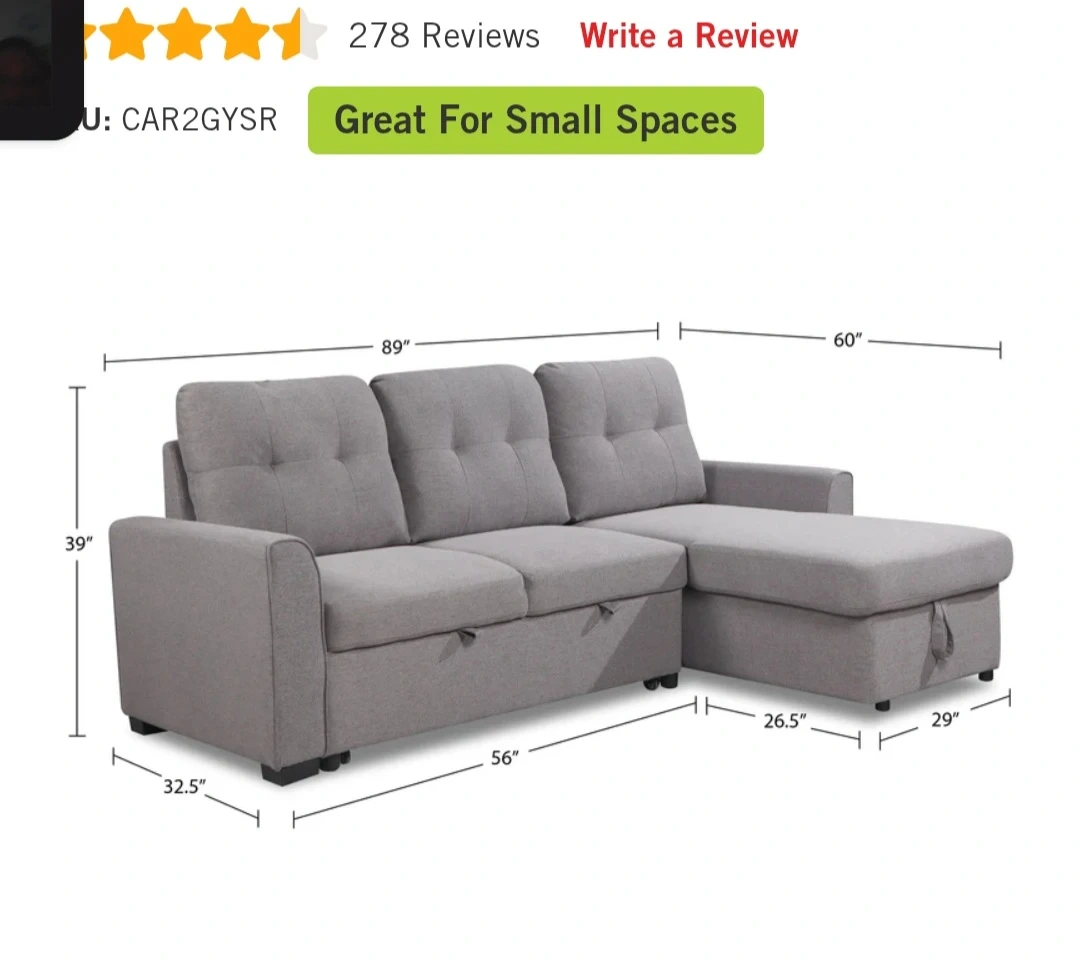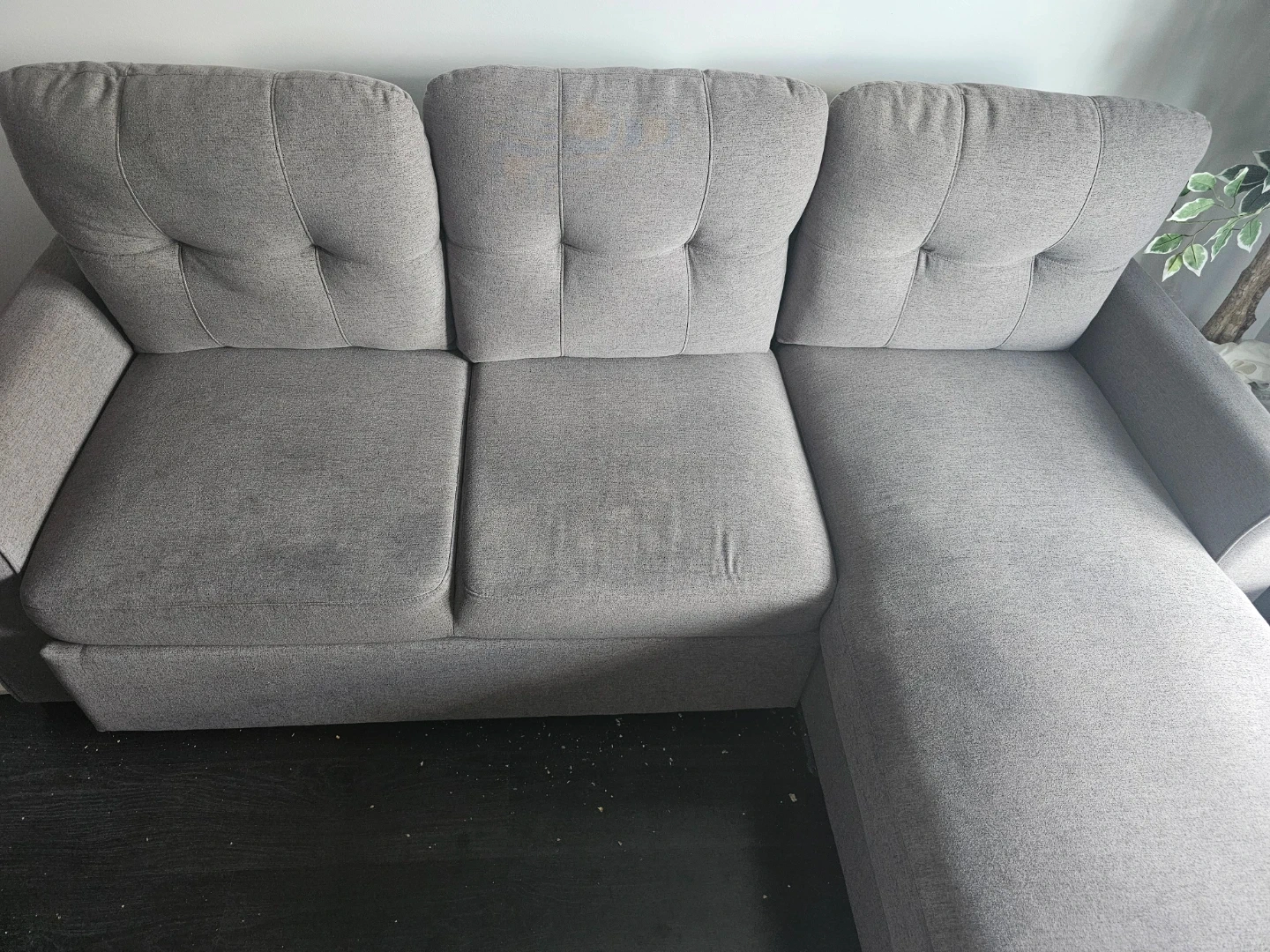 This grey sectional sofa features a convenient storage chaise. It's great for small spaces and offers ample seating. Includes storage under the chaise.