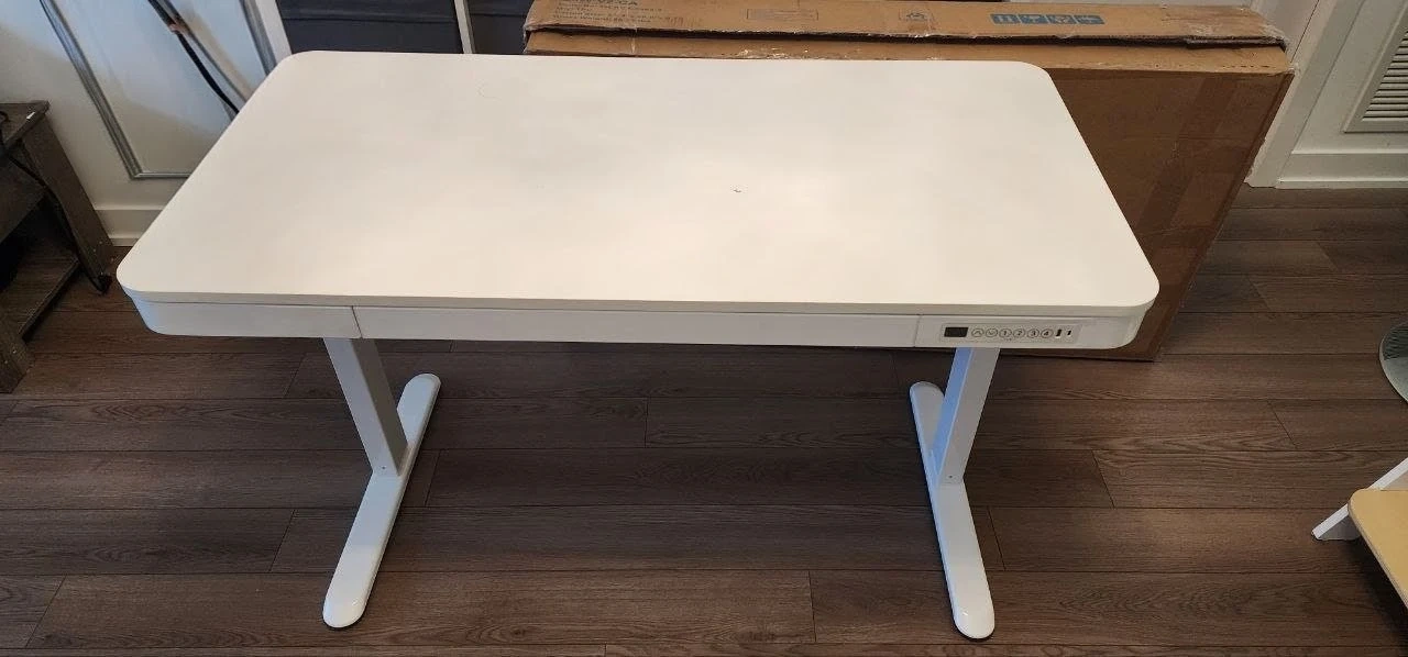This is a brand new flexispot white standing desk with a drawer. It has an adjustable height feature controlled by buttons on the side. When it got delivered there was a small damage spot on the top (image 3). Never used, just tested to see if it works. Comes with the box.