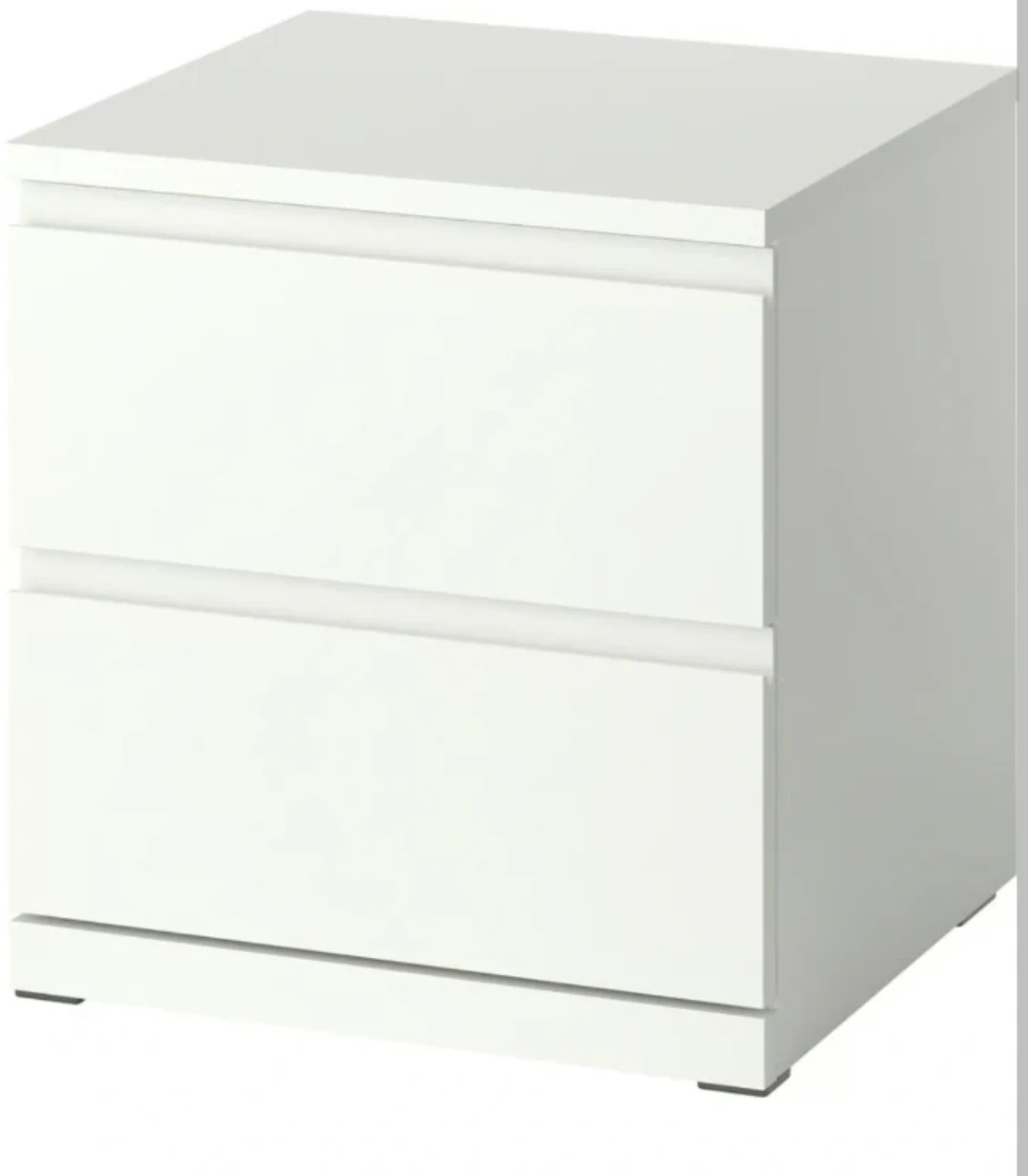 White nightstand with two drawers. It's a tidy storage solution for your bedroom. Drawer fronts have a smooth, clean look. The unit sits on small feet for stability.