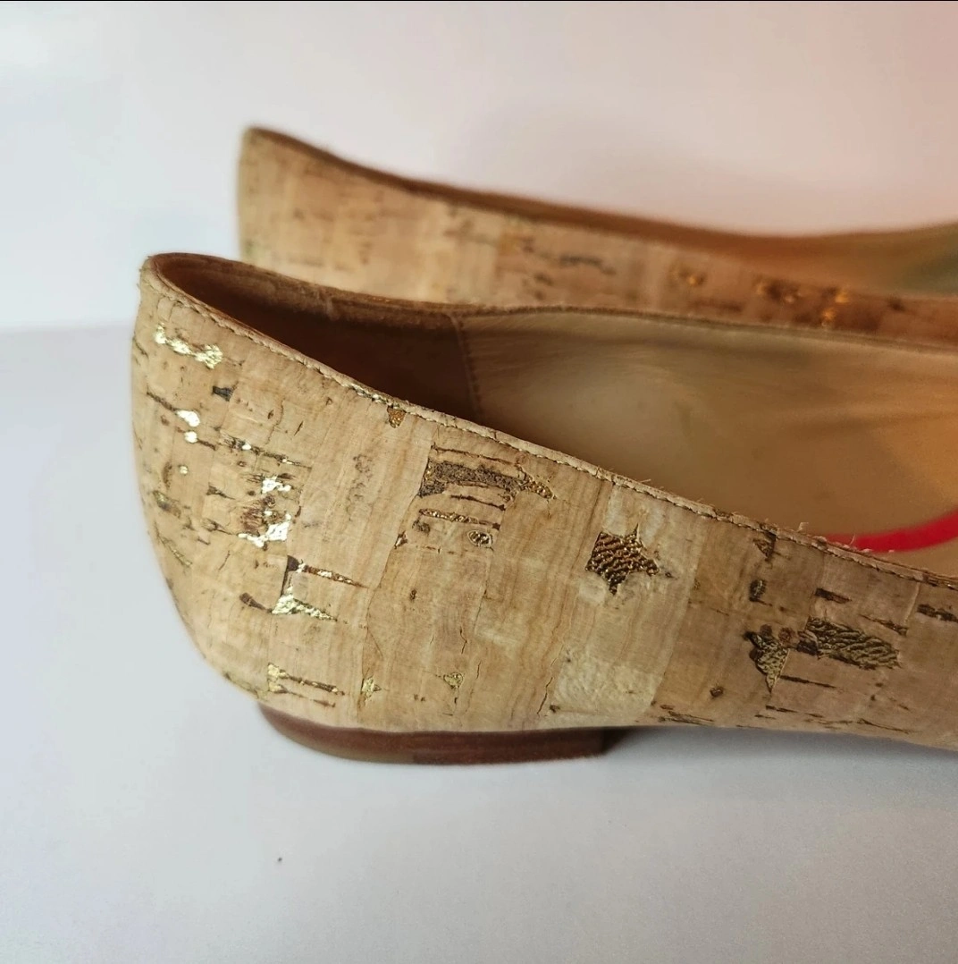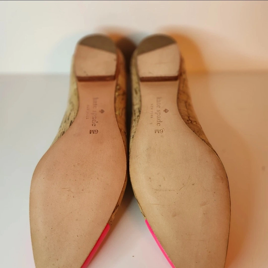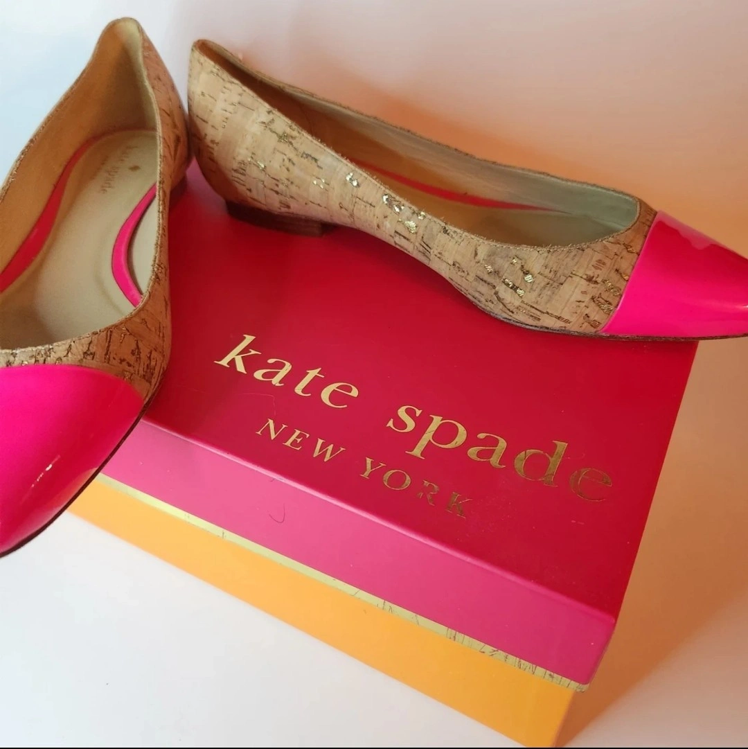 These stunning Kate Spade neon leather flats are in pristine condition. Gorgeous neon pink patent leather capped toes. Luxurious cork leather mixed with metallic gold rivers running throughout.