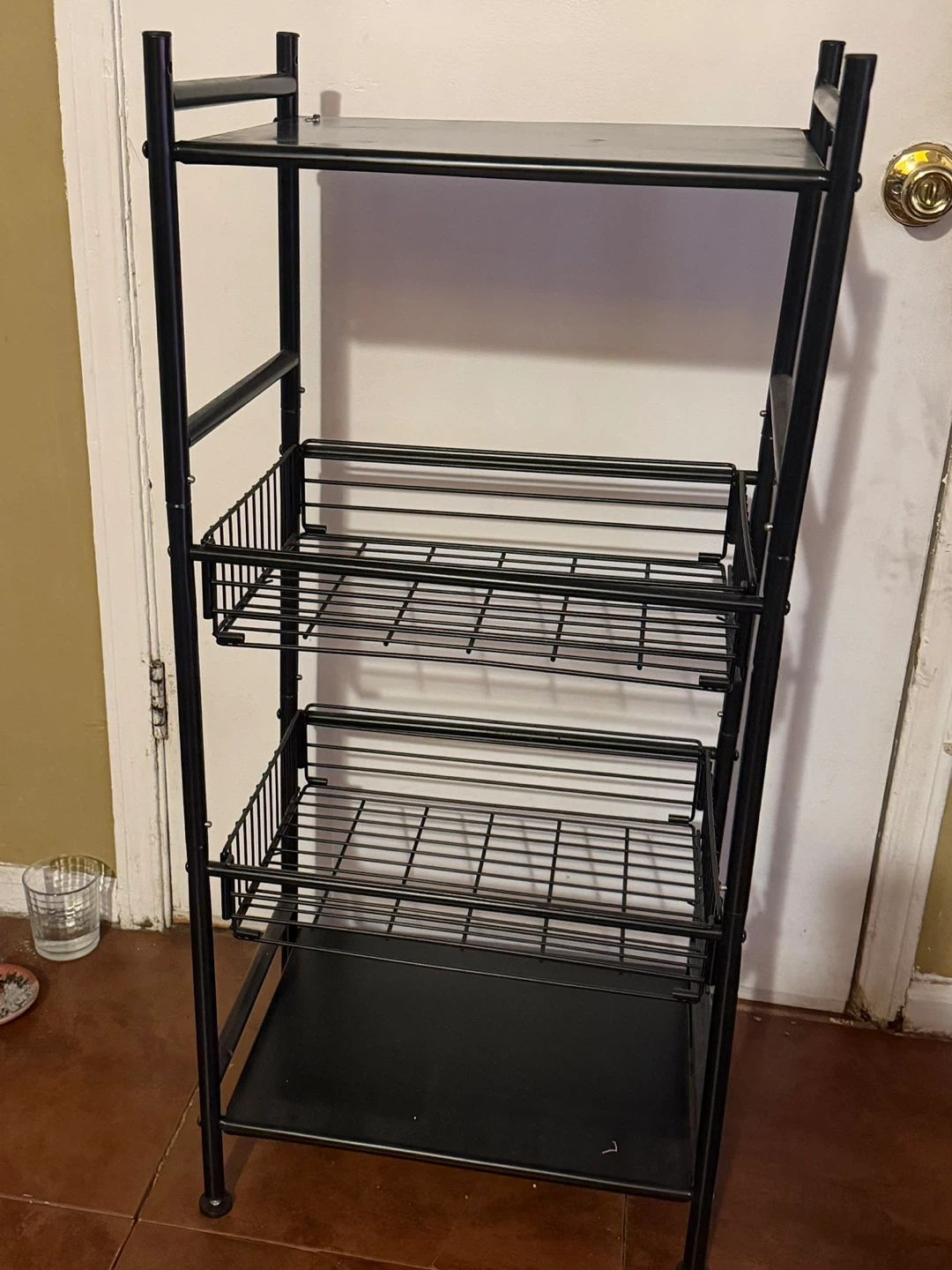Black metal construction with four tiers. Two tiers feature wire baskets, and two are solid shelves. A lean-back ladder design.