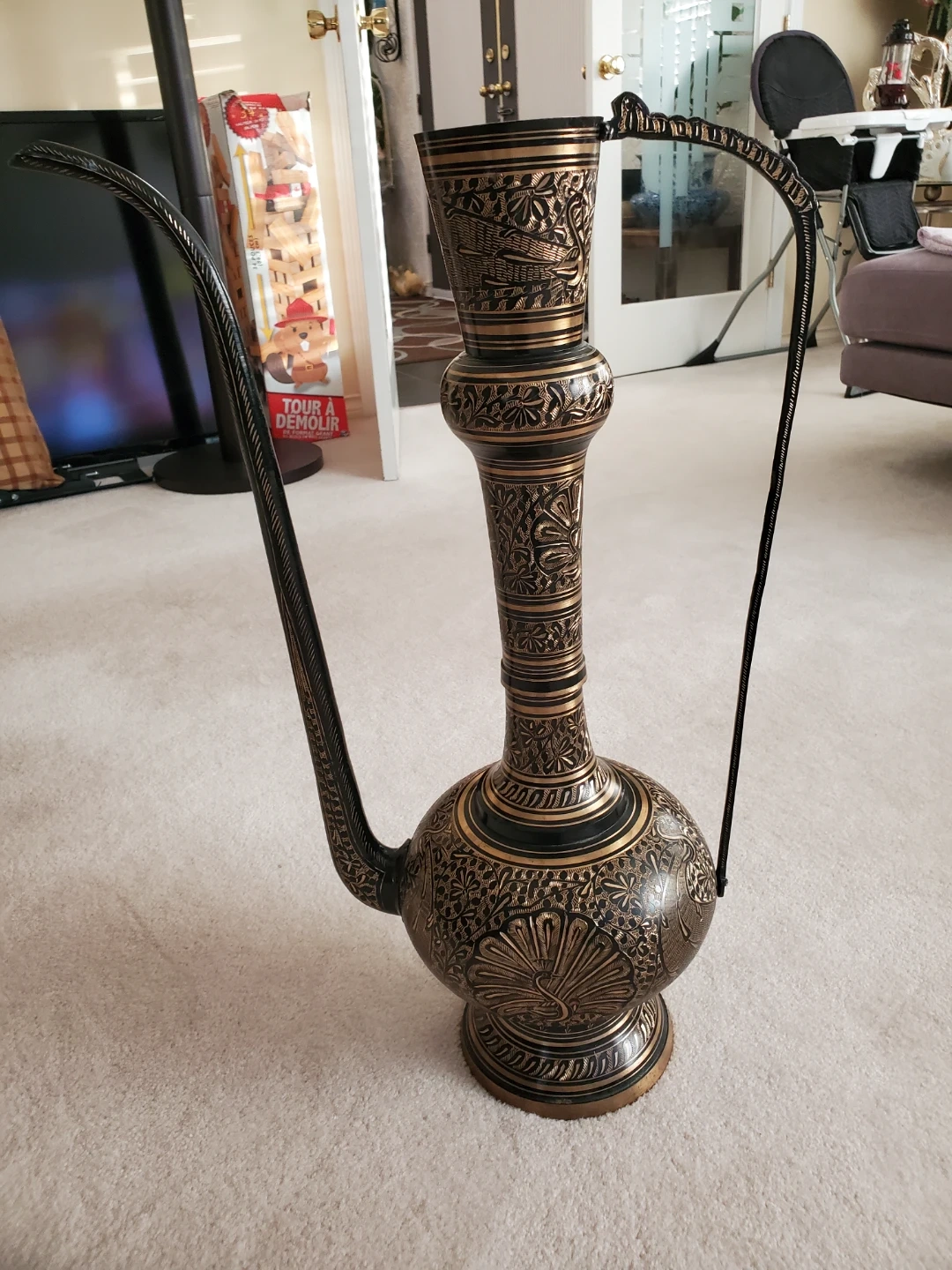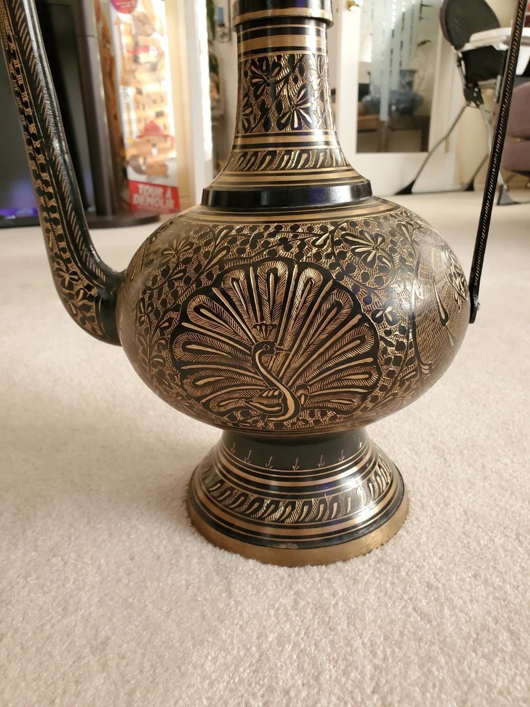 This is a decorative metal pitcher with an intricate peacock and floral design. It's made of brass with black accents. It's a beautiful piece for display or serving.