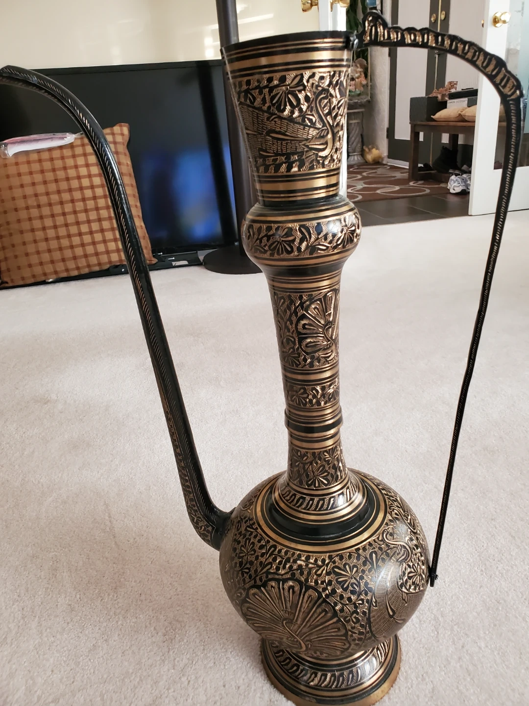 This is a decorative metal pitcher with an intricate peacock and floral design. It's made of brass with black accents. It's a beautiful piece for display or serving.