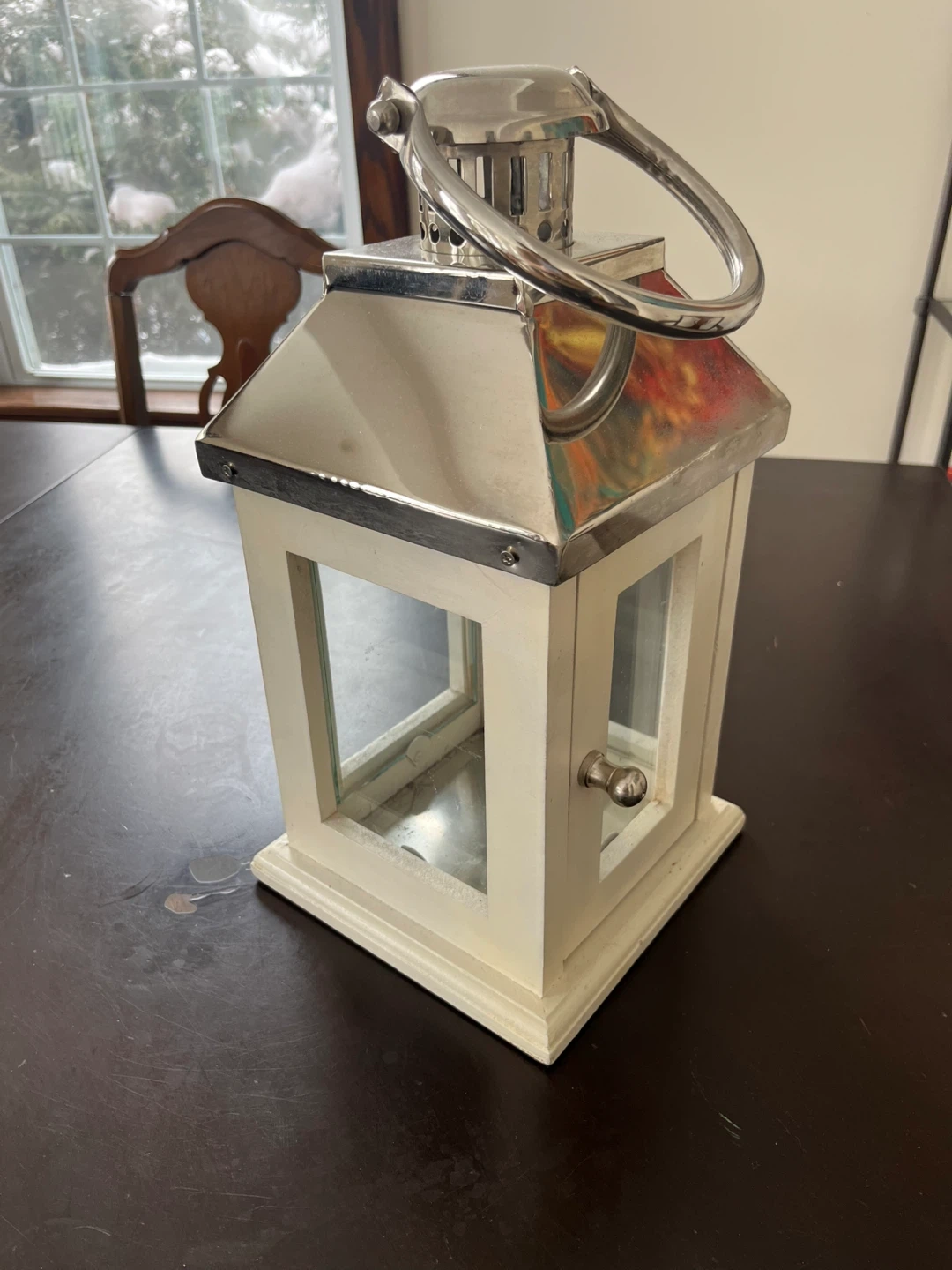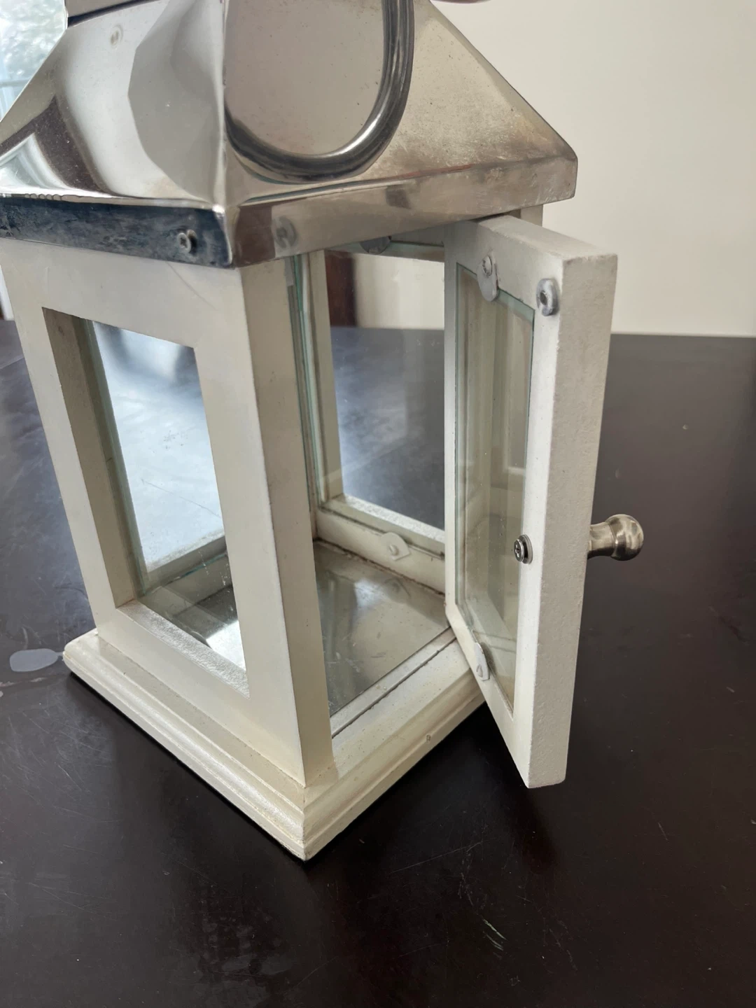 Decorative white wooden lantern with a silver metal top and handle. It features glass panels and a small door with a knob. Smoke and pet free home. Can also meet in Bradford