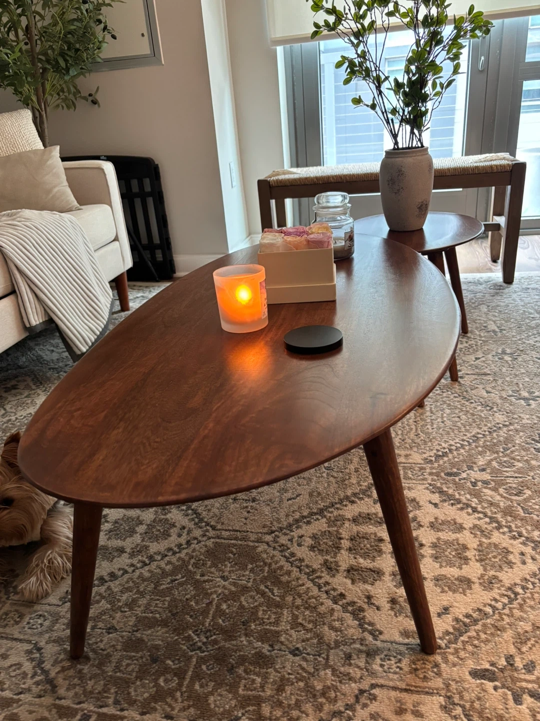 This is a beautiful mid-century modern style oval coffee table. It's crafted from rich walnut wood with tapered legs. Its unique shape makes it a great focal point for your living space! Measures approximately 47" long, 23" wide, and 16" high.