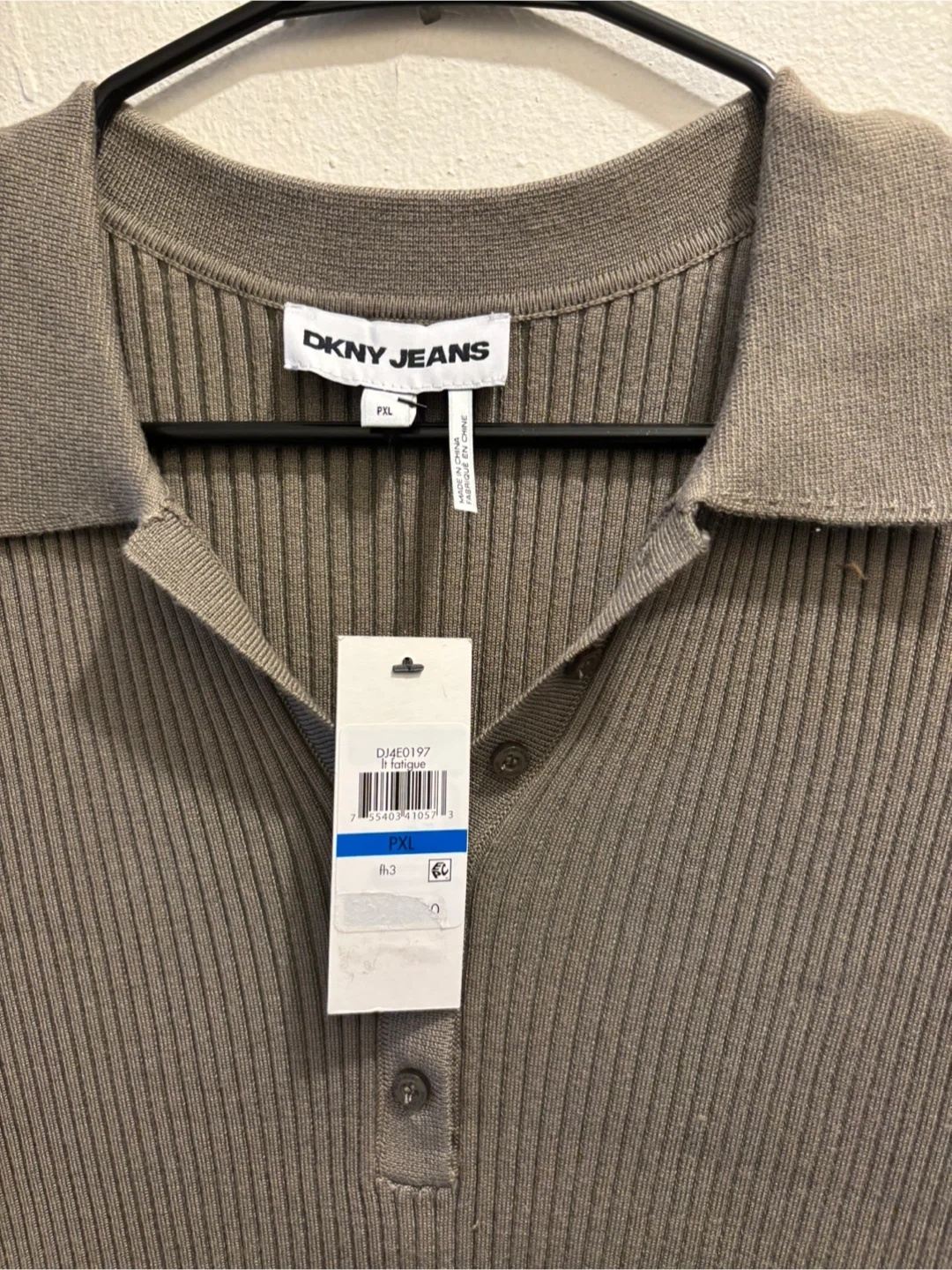 This is a DKNY Jeans women's ribbed knit shirt. It's a size PXL and features a collared neckline with button closure. The shirt is a taupe color.