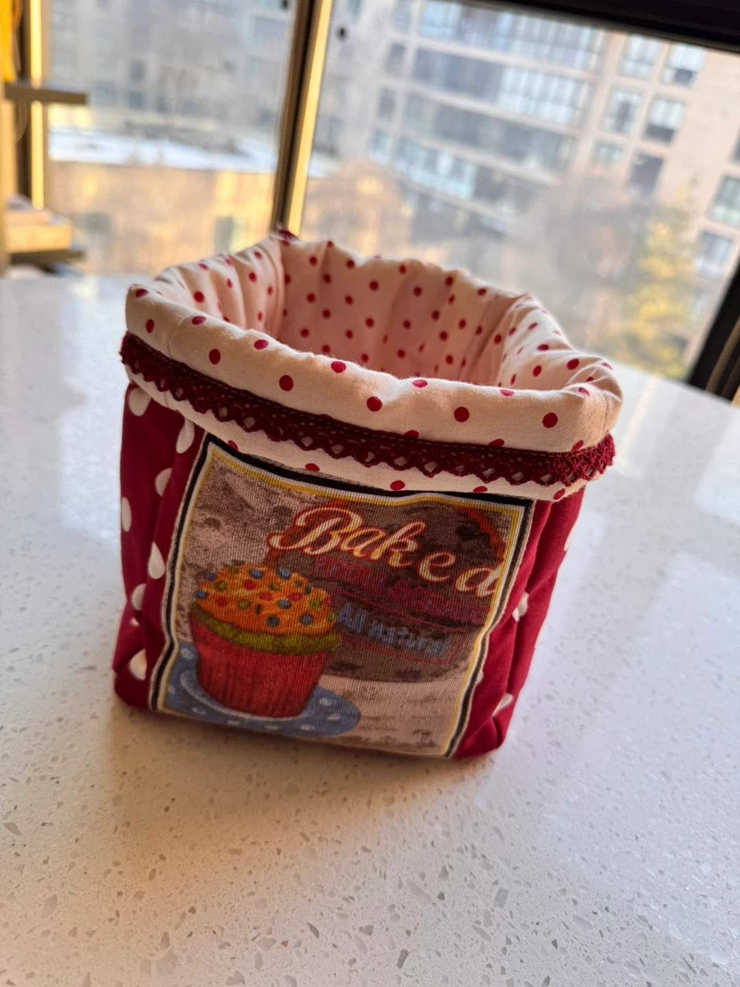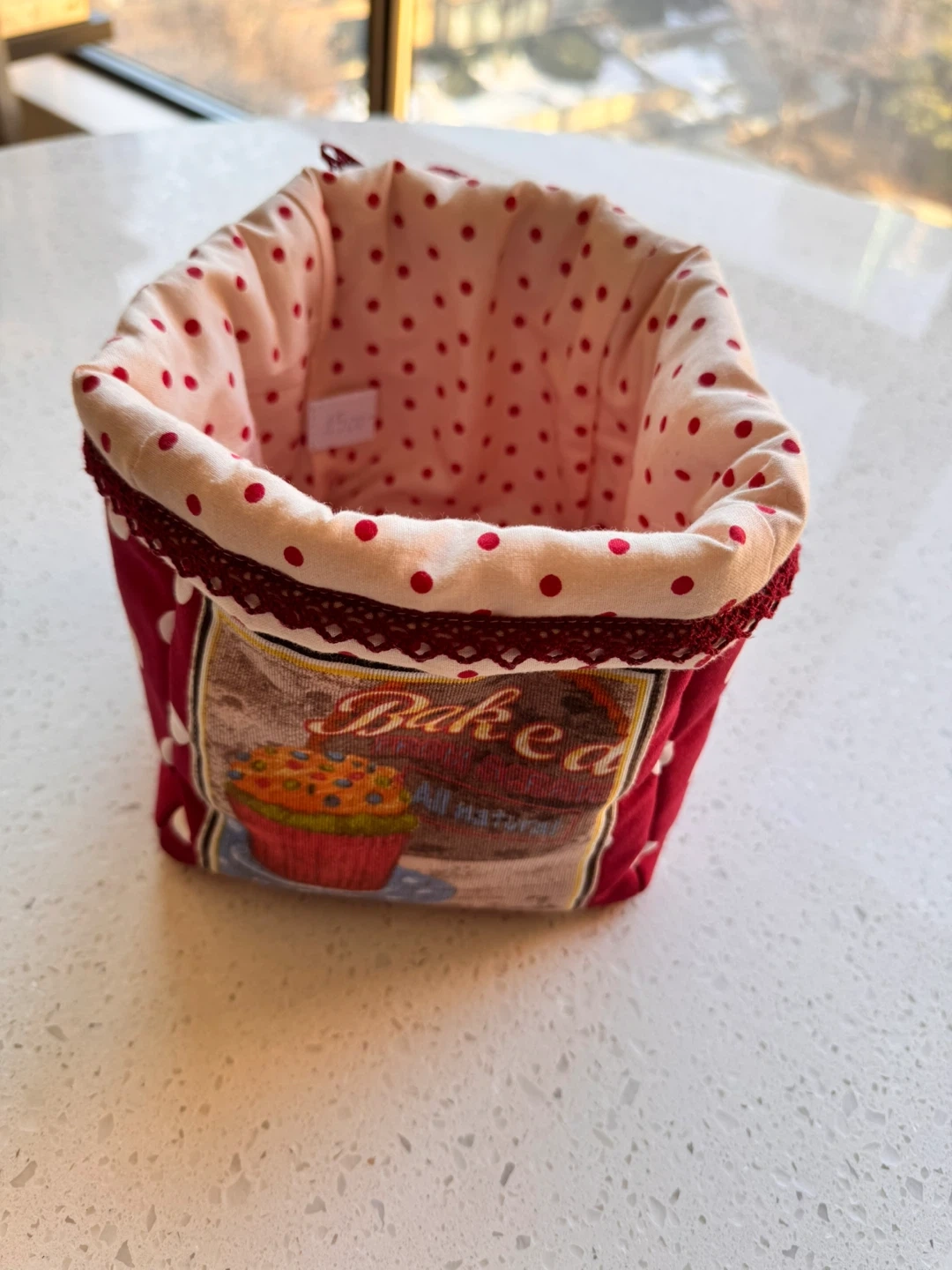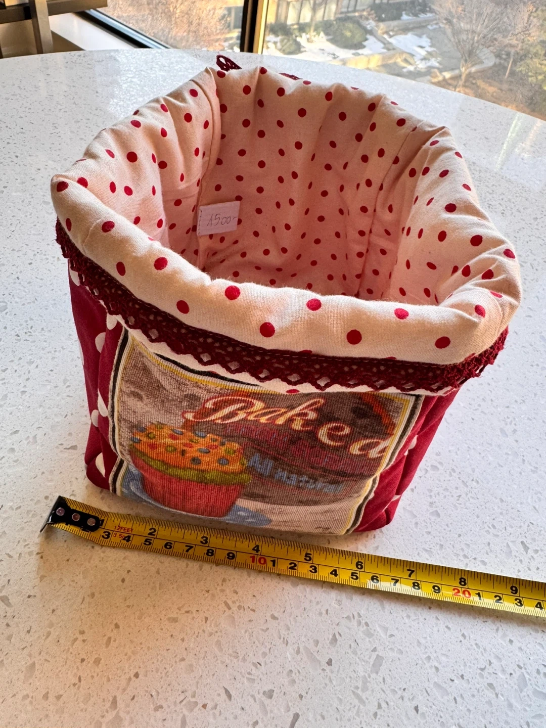 Quaint fabric storage bin featuring a red exterior with white polka dots and a decorative panel with "Baked" and a cupcake graphic. The interior is lined with a pink fabric also adorned with red polka dots. It's perfect for organizing small items on a counter or shelf. A measuring tape shows it's approximately 6 inches tall.