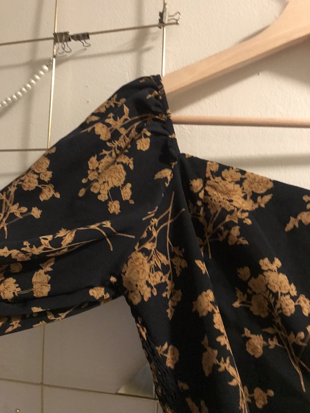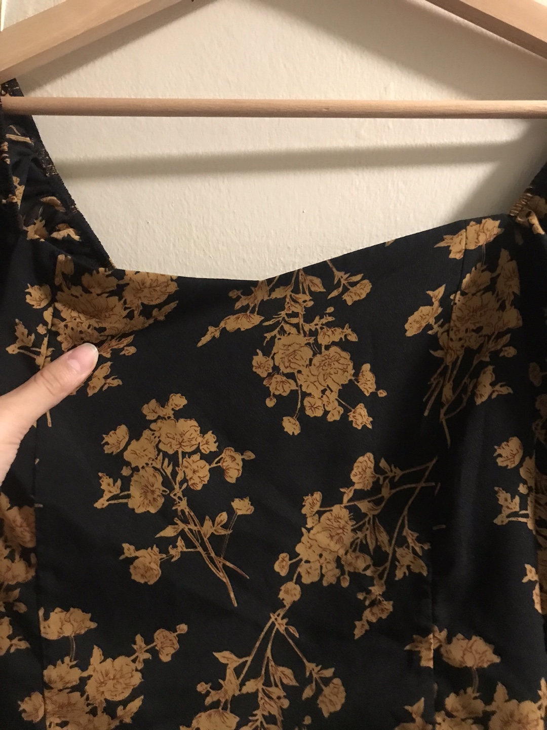 This is a cute blouse with a black background and a gold floral print. It's perfect for dressing up or down! The blouse has a square neckline and puffy sleeves.