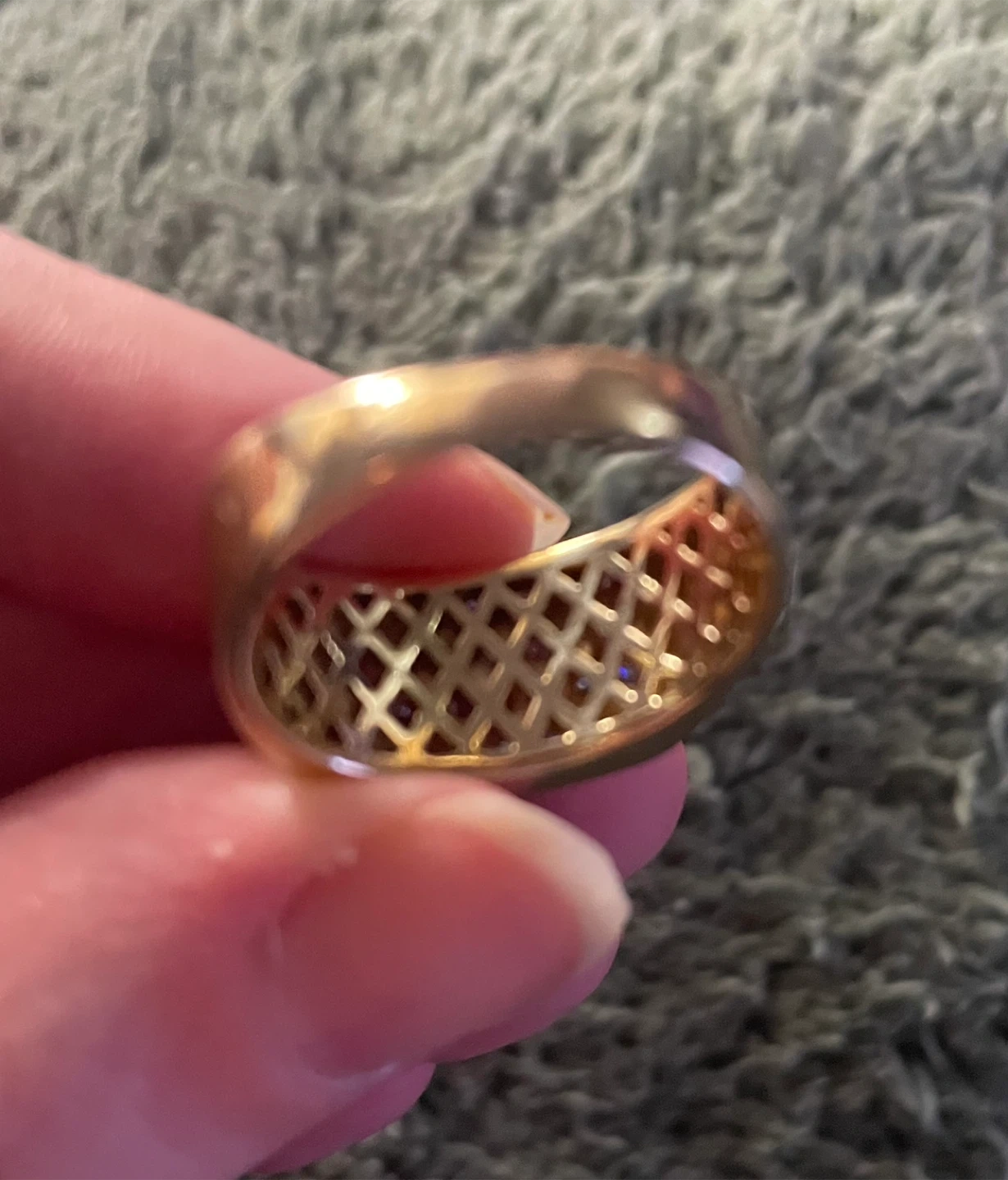 10kt gold ring with 28 diamonds (SI 2 clarity, I colour) total approx 1 carat. It has a unique open lattice design on the inside band. It’s around size 9 but not certain. Appraisal value $4750.00