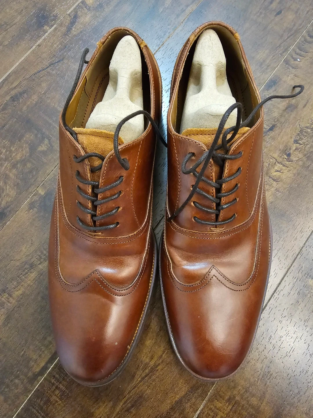 Stylish brown leather wingtip Oxford dress shoes. Classic brogue detailing and lace-up closure. Genuine leather upper and lining for comfort. Durable sole for everyday wear.