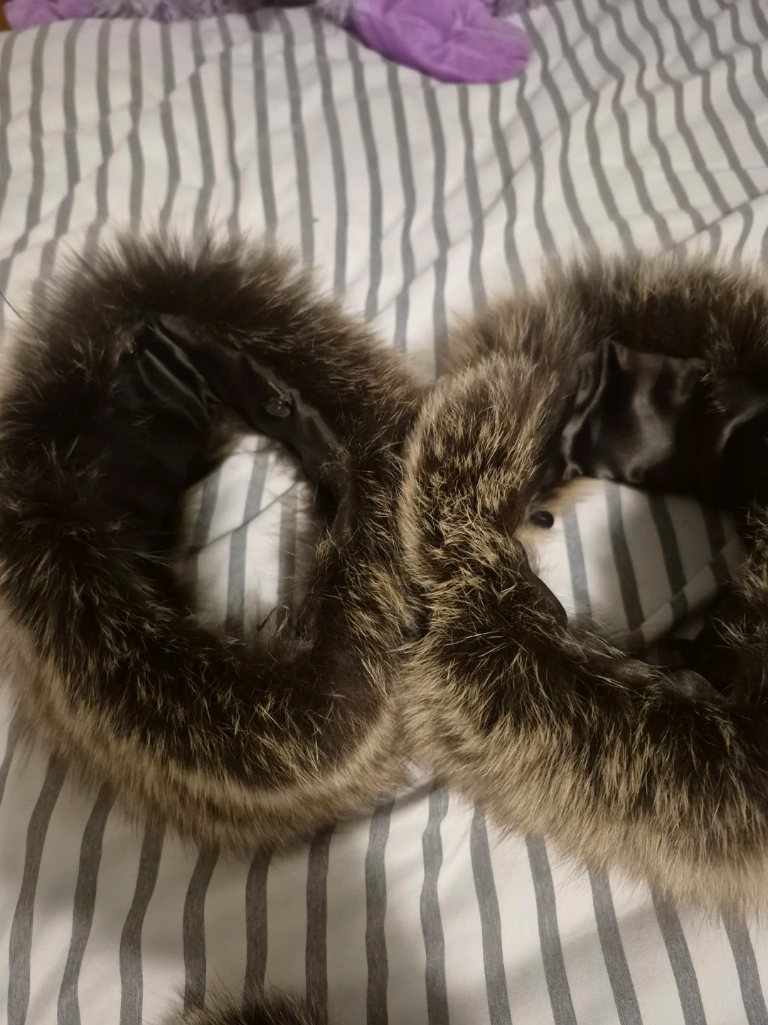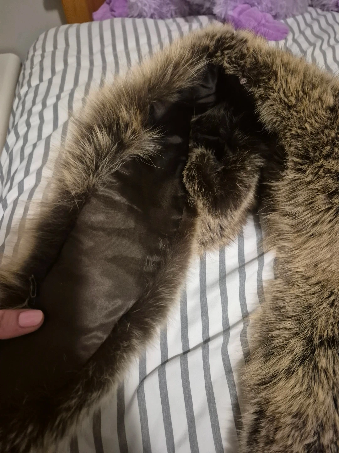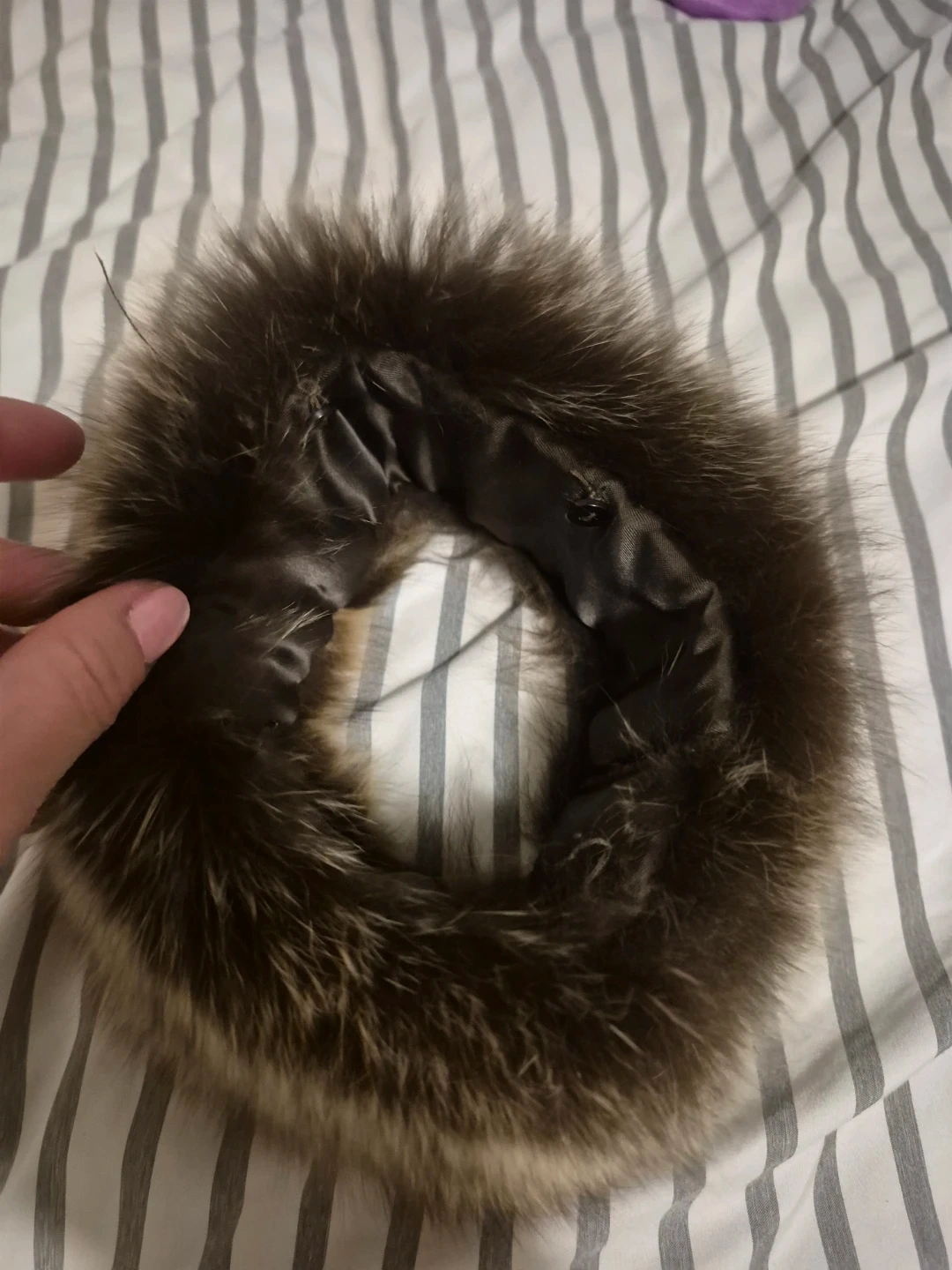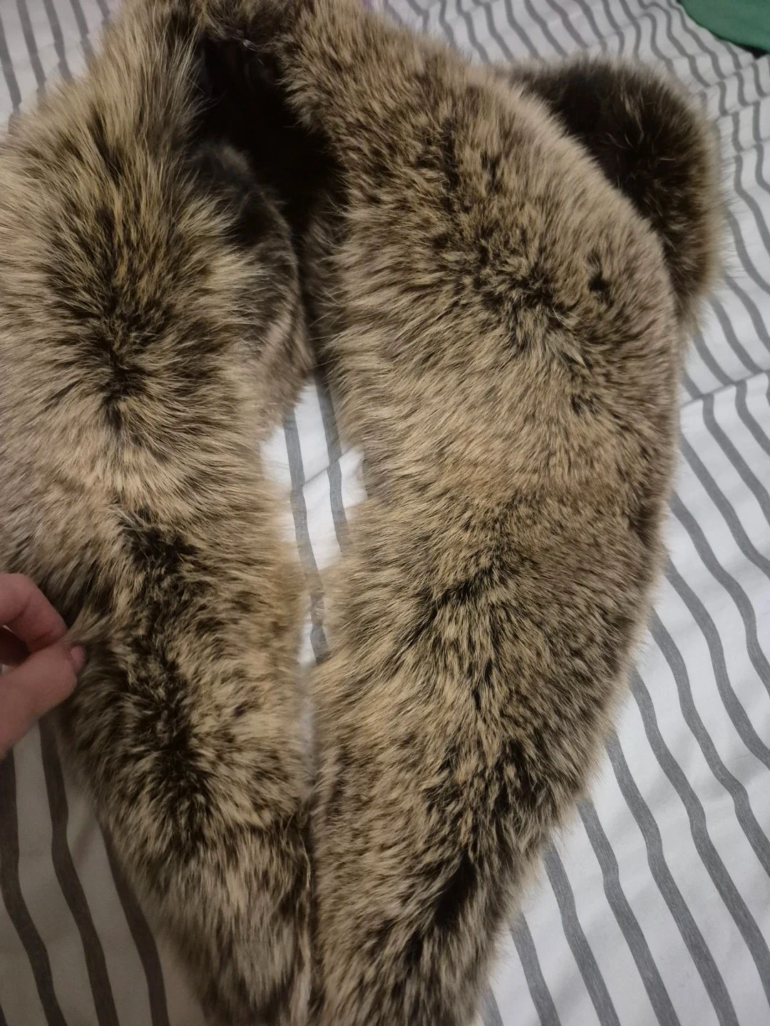A cozy real fur collar. It's lined with satin and has a natural brown and grey colour. It's the perfect accessory for adding warmth and style to any jacket or coat!