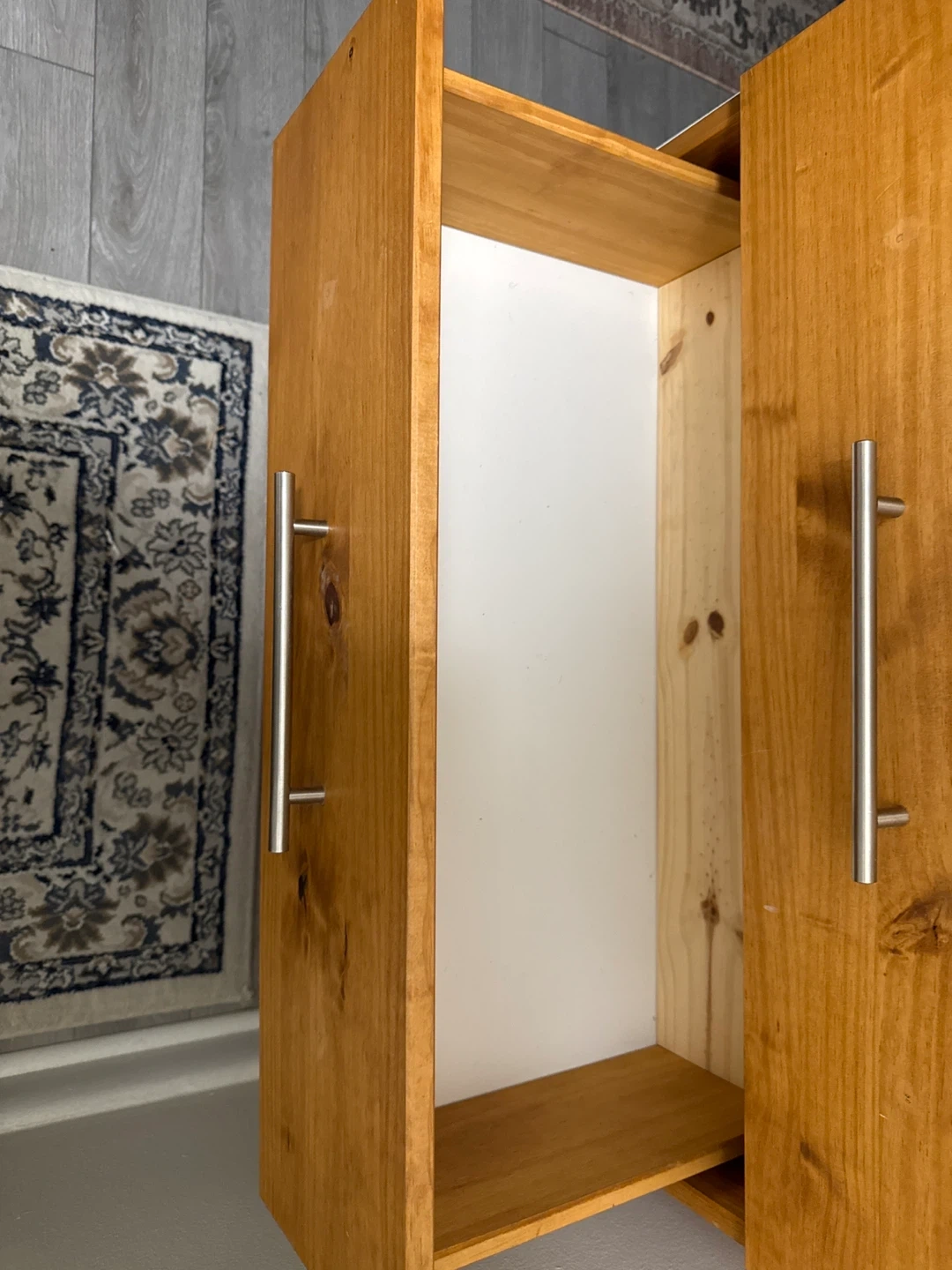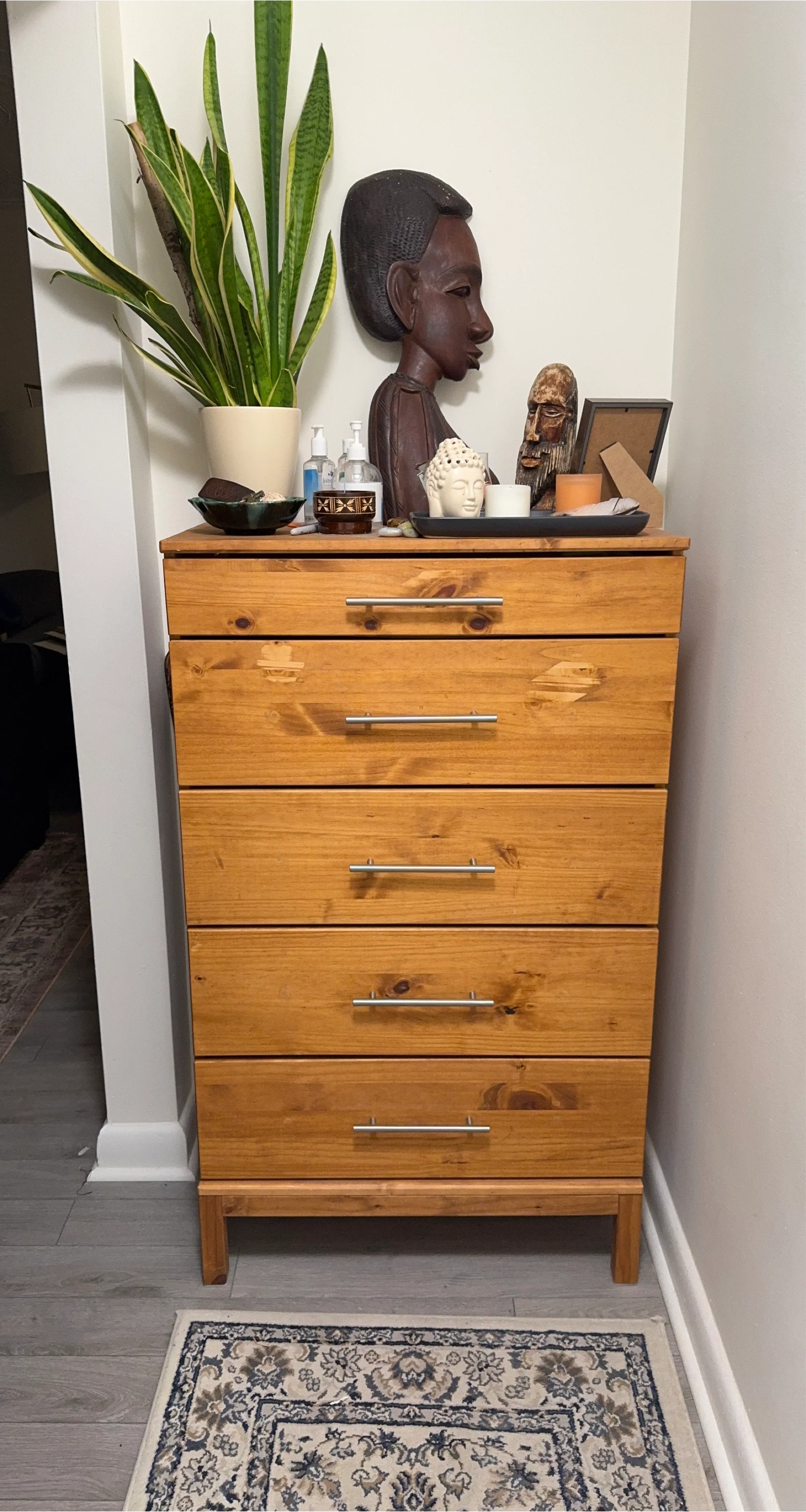 This pine chest of drawers offers ample storage. It features five drawers with brushed nickel handles. Great for organizing clothes or linens in any room!