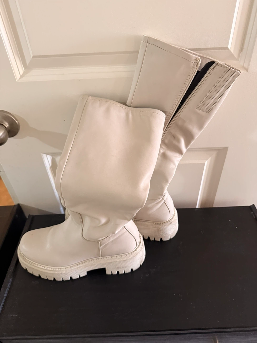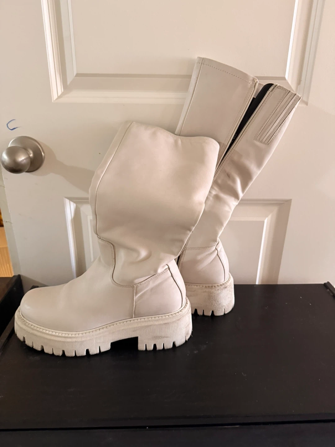 Cream white knee-high boots with a chunky platform sole. They feature a side zipper for easy wear. Material appears to be faux leather.