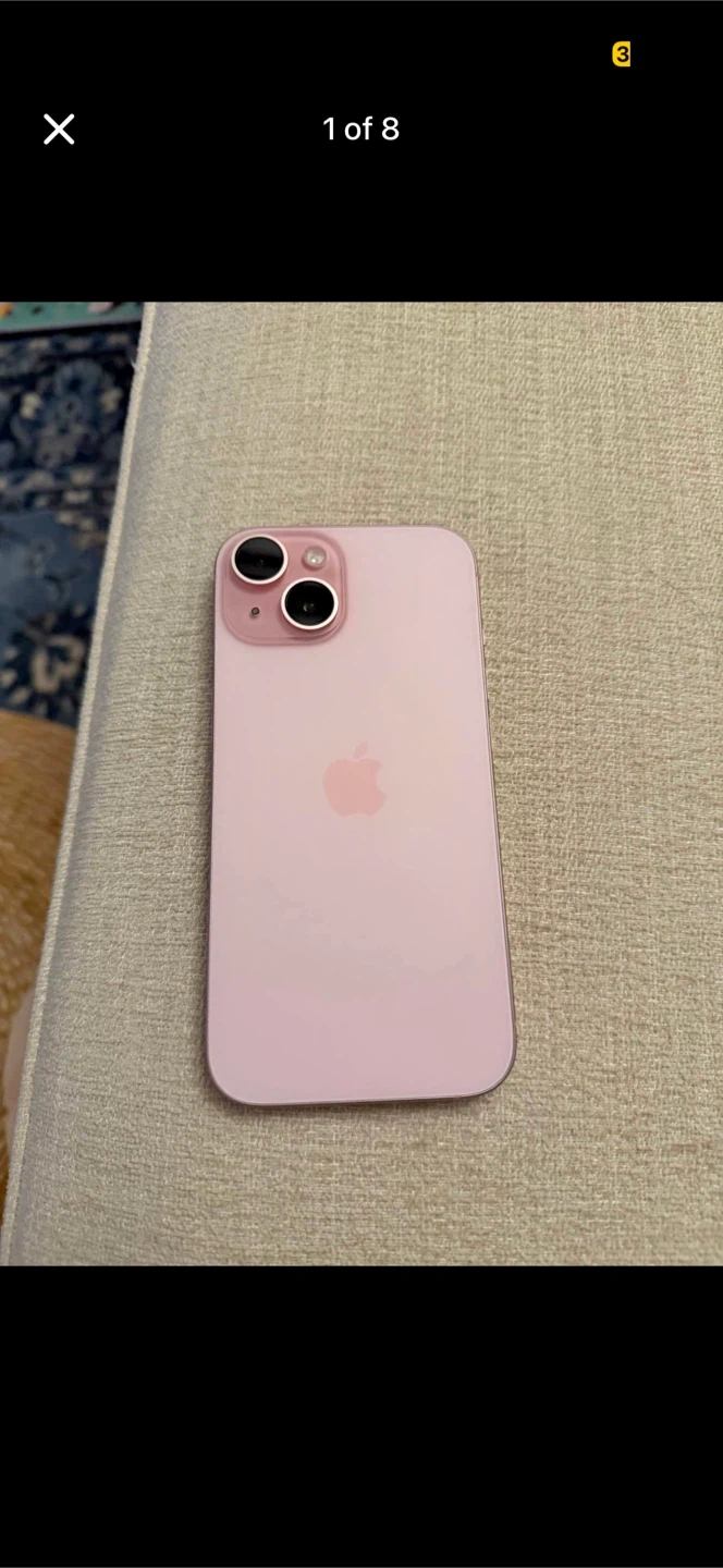 This is a pink Apple iPhone 15. Battery health is normal with a maximum capacity of 87%. Manufacture date is November 2023 and first use was January 2024. Cycle count is 939.