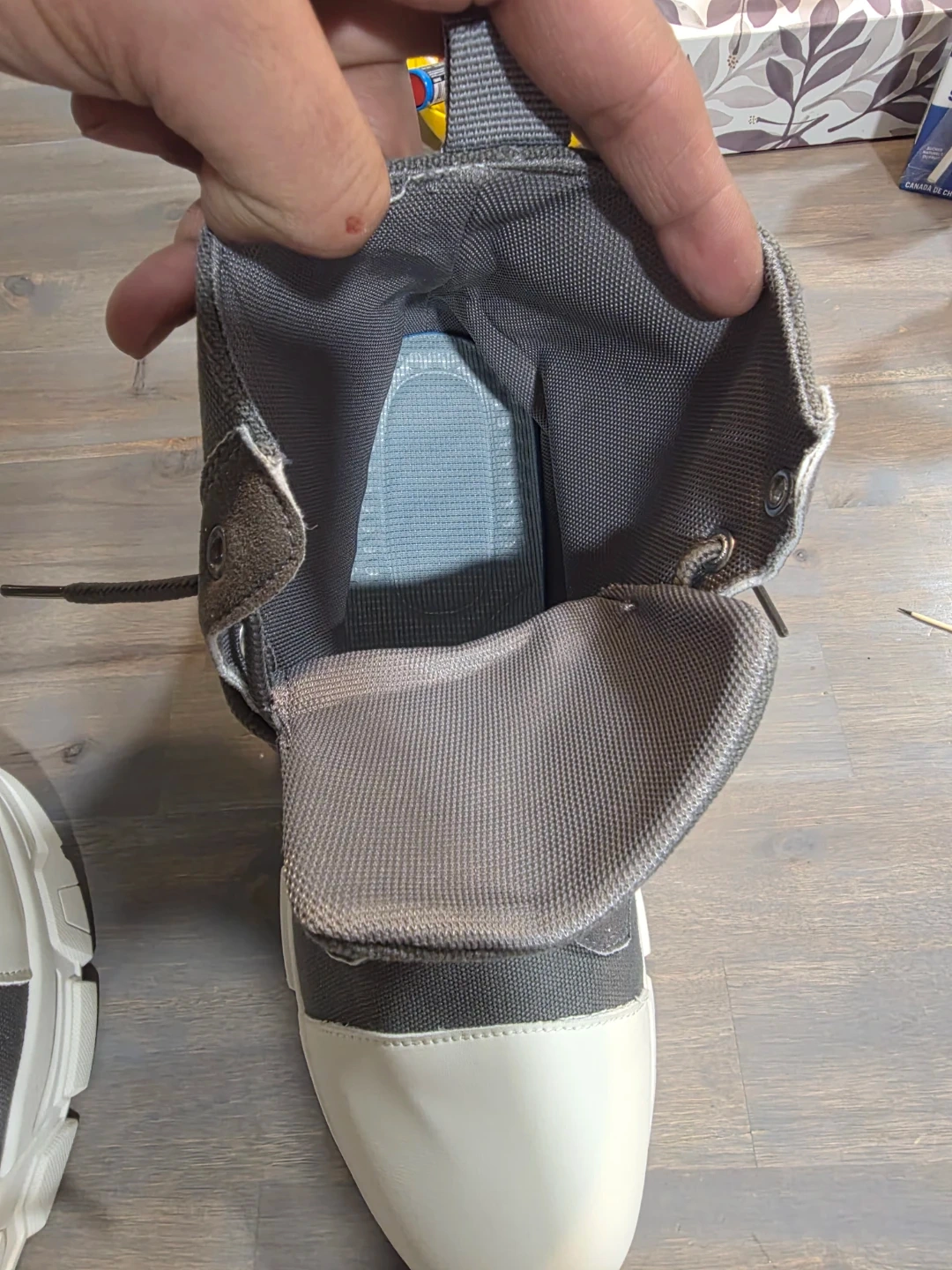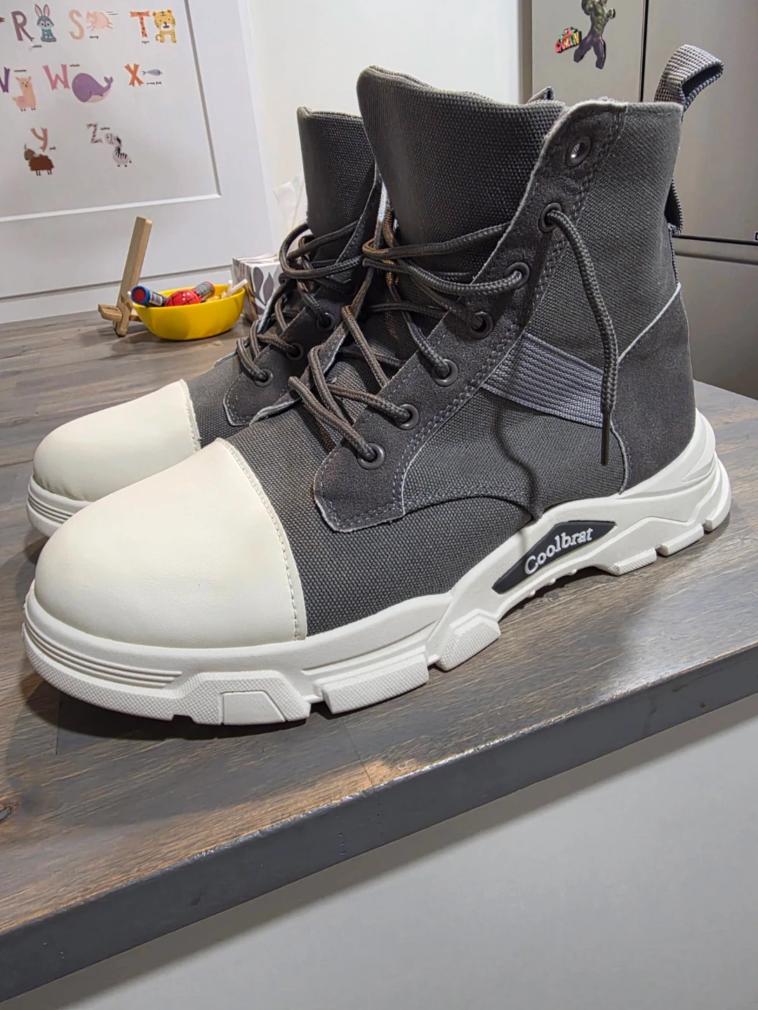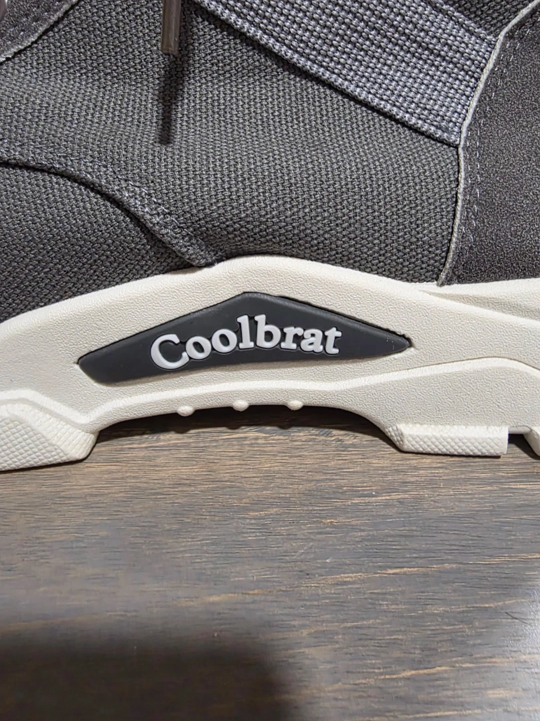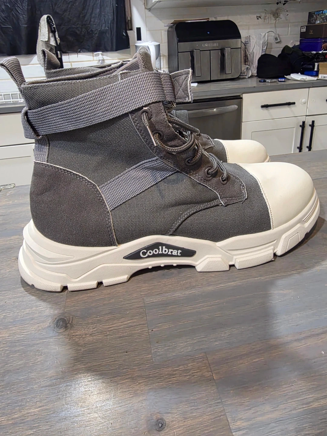 I am Selling a pair of Coolbrat boots in grey and white! They feature a unique design with laces and a strap.