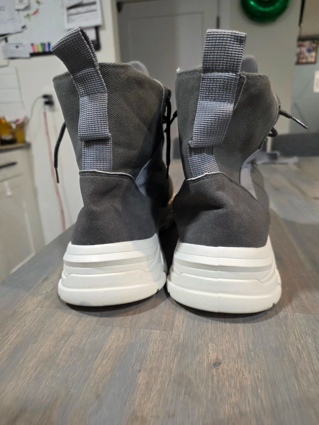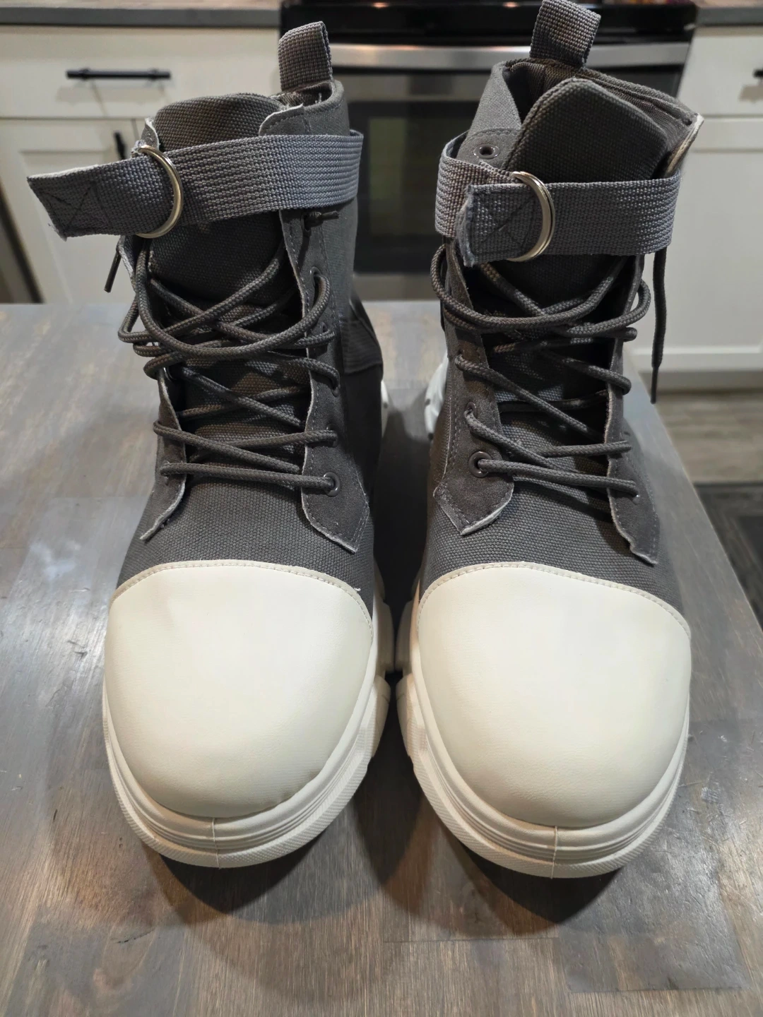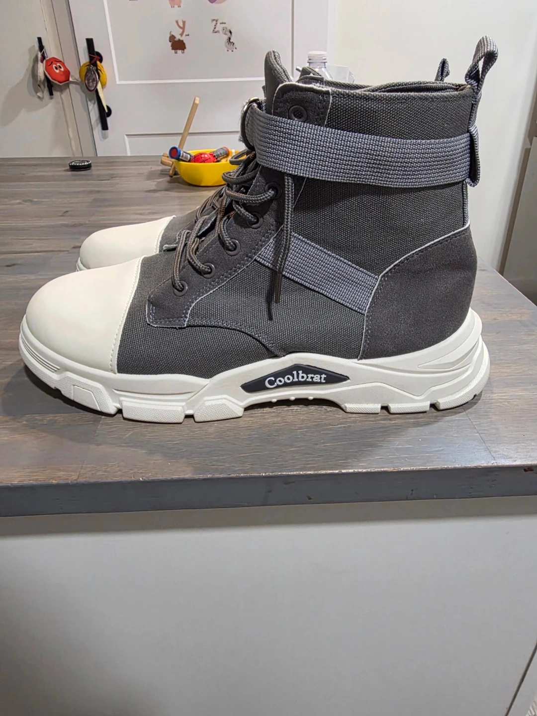 I am Selling a pair of Coolbrat boots in grey and white! They feature a unique design with laces and a strap.