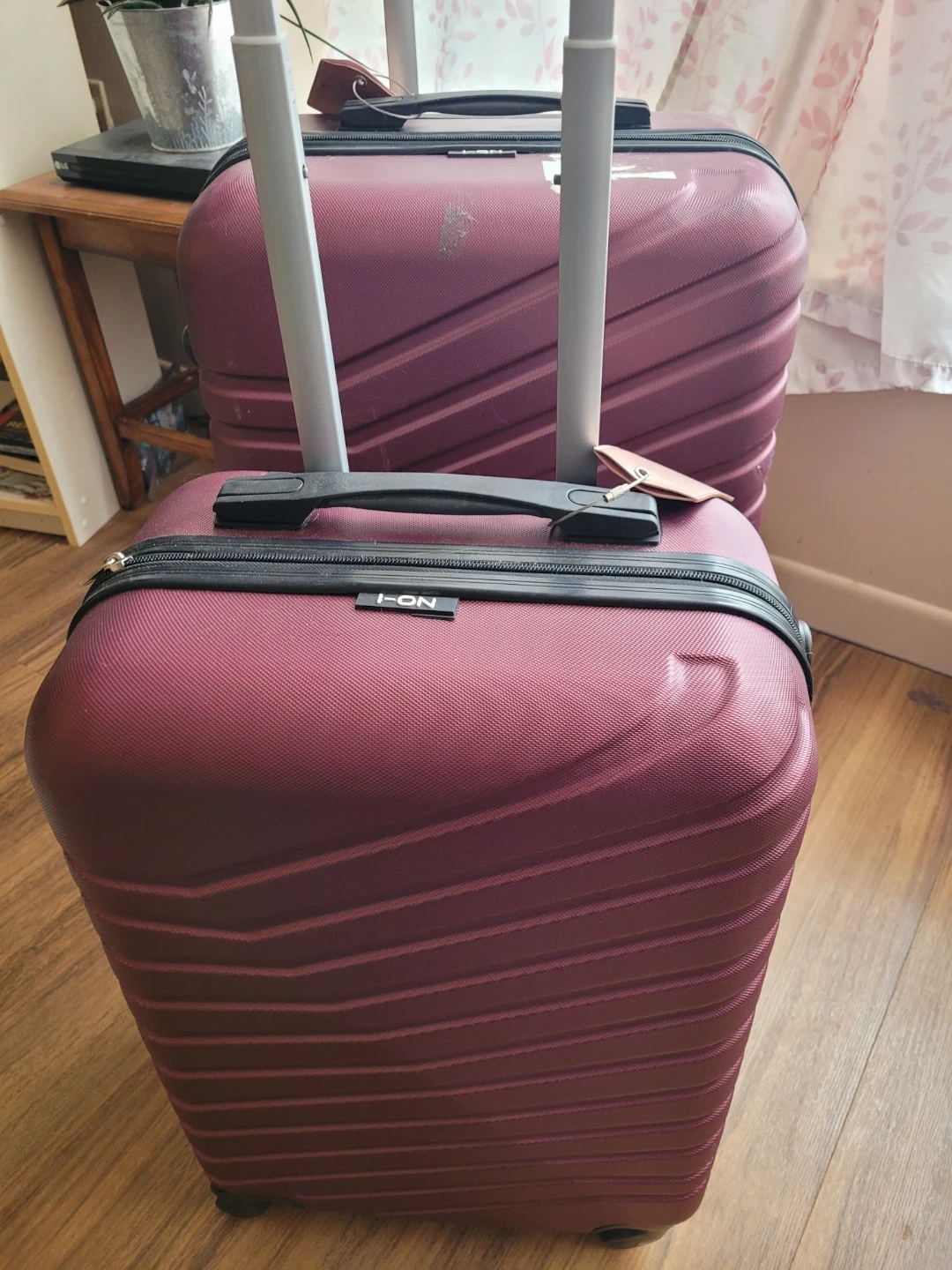 Two burgundy hard-shell suitcases from ION. Includes one large and one carry-on size. Both have wheels and retractable handles.