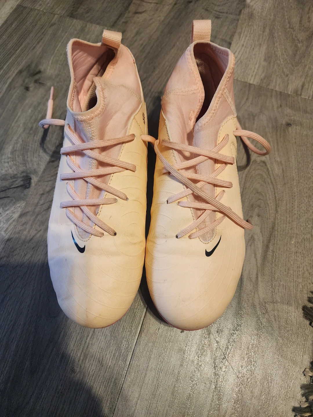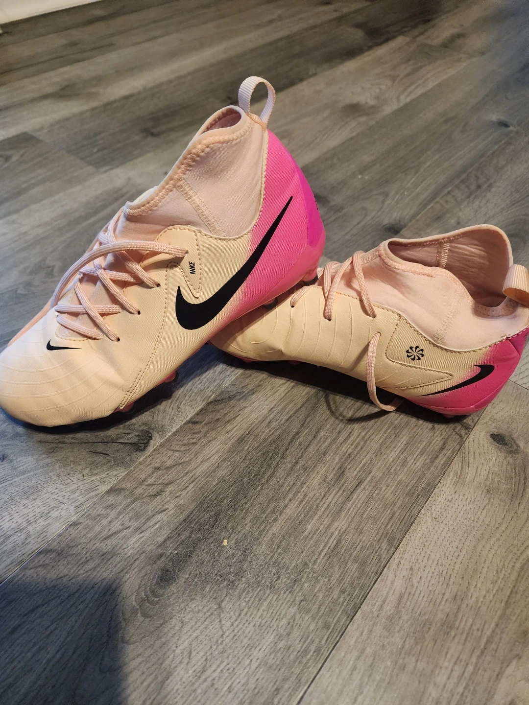 These Nike Mercurial soccer cleats are a vibrant pink and peach colour. They are youth size 5.5Y. Perfect for hitting the soccer pitch!