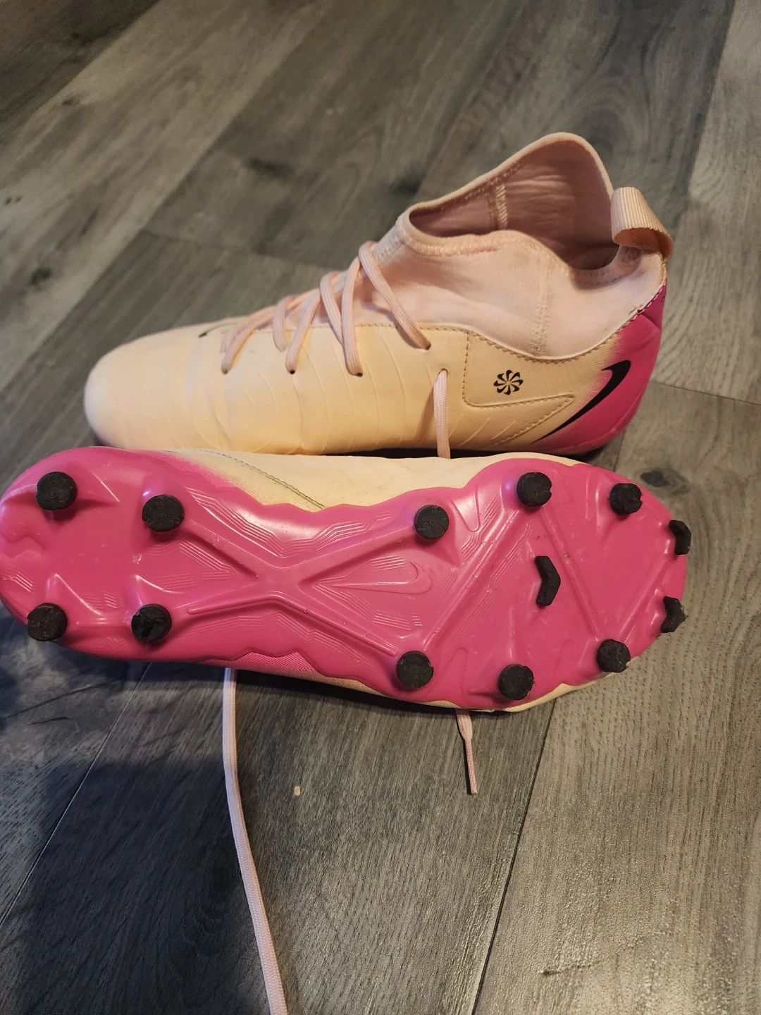These Nike Mercurial soccer cleats are a vibrant pink and peach colour. They are youth size 5.5Y. Perfect for hitting the soccer pitch!