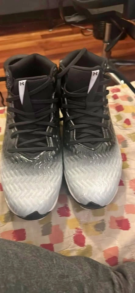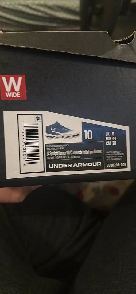 Selling my Under Armour Spotlight Hammer Wide football cleats (Size 10). Only used for one practice — basically brand new. Too small for me. Wide fit for extra comfort. Excellent traction and stability for football. They have high ankle support, great for linemen positions.