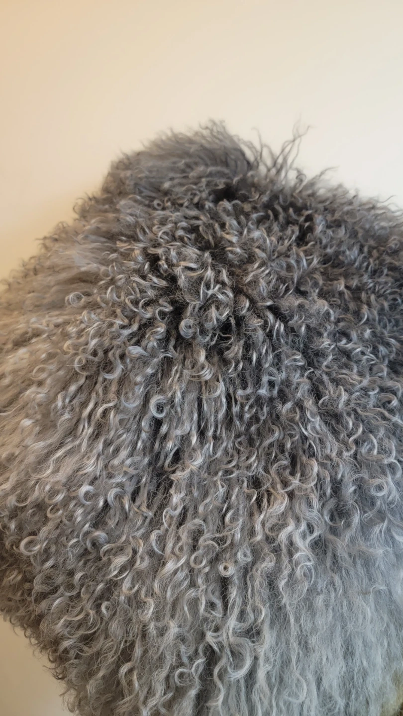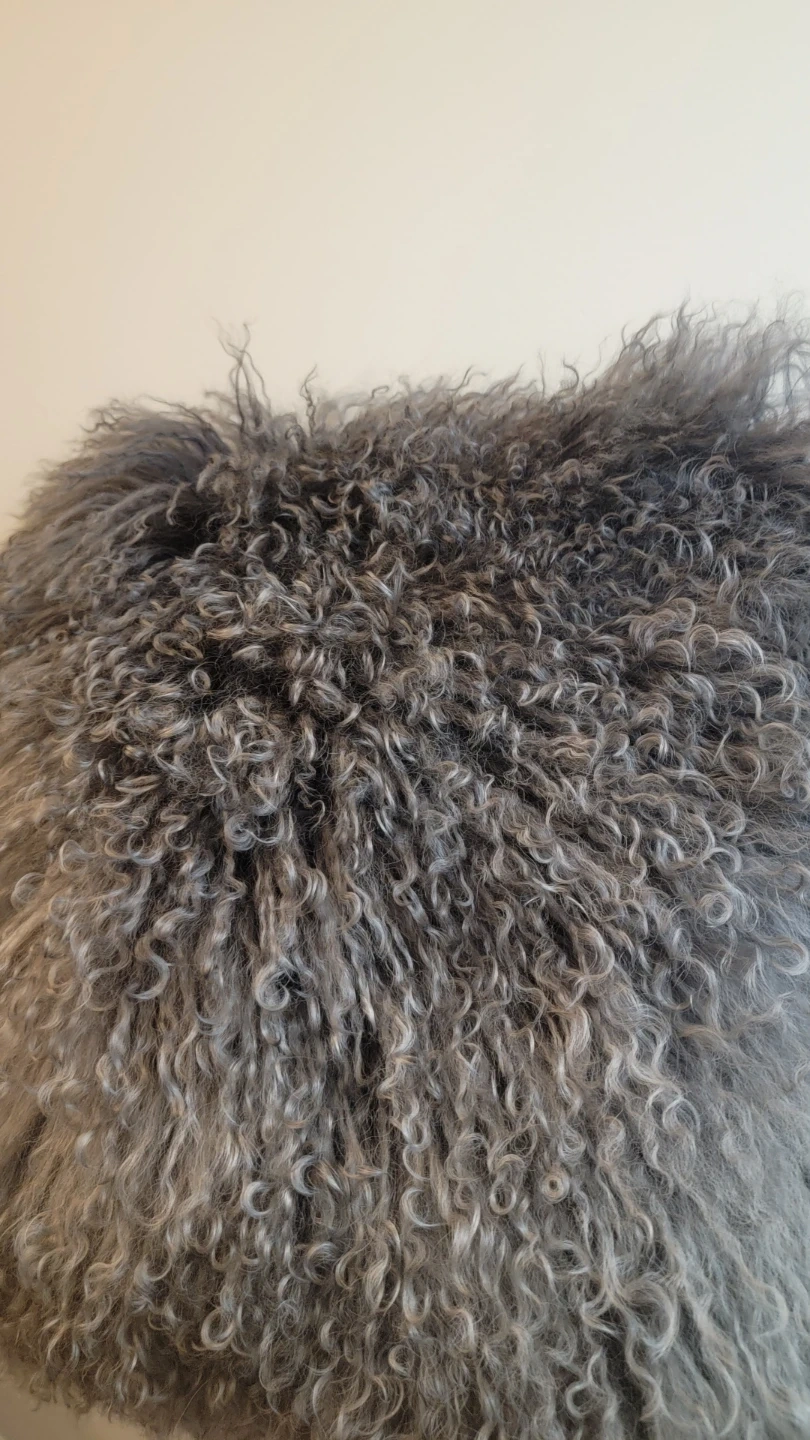 Selling a cozy grey throw pillow with a distinctive curly sheepskin fur texture. It's made from genuine sheepskin fur. This gorgeous ombre grey throw pillow is a great accent piece for any room!
