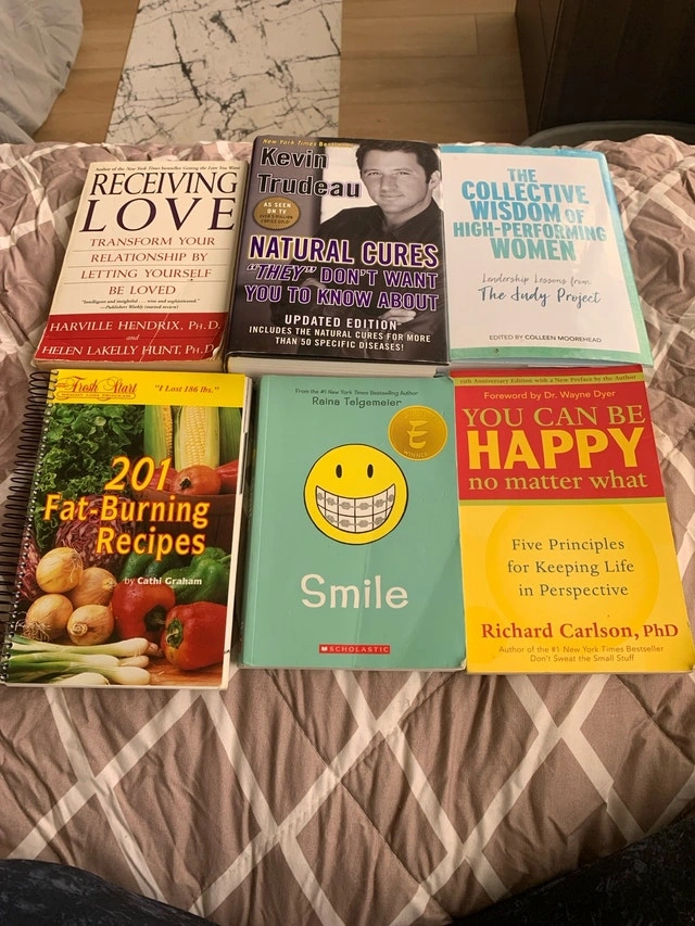 Offering a collection of used motivational books, perfect for anyone looking to enhance their personal development journey. Included are titles such as 'Receiving Love,' 'Natural Cures They Don't Want You to Know About,' 'The Collective Wisdom of High-Performing Women,' '201 Fat-Burning Recipes,' 'Smile,' and 'You Can Be Happy No Matter What.' As these books have been previously enjoyed, their condition varies; however, they remain in good, readable shape and are ready to inspire their next owner. The set is priced to reflect their used status. If the ad is up, the books are available!