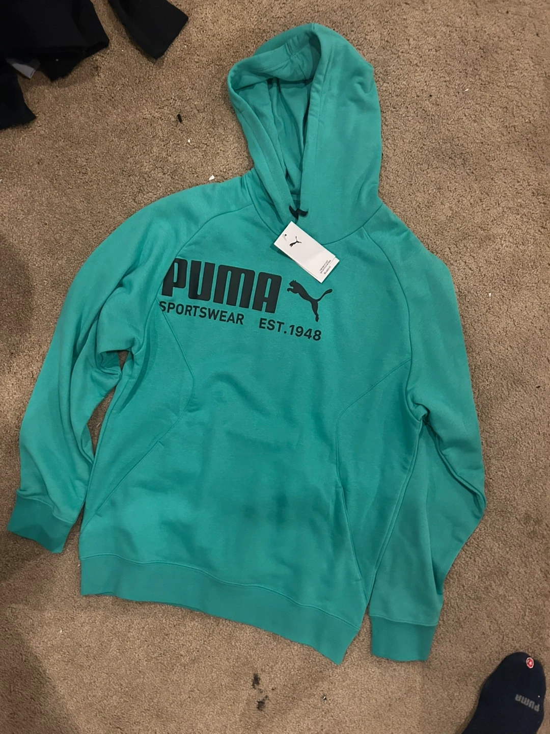 This is a brand new teal Puma hoodie with the classic Puma logo and 'Sportswear Est. 1948' printed on the front. It's a comfortable and stylish hooded sweatshirt. It features a front pocket and a drawstring hood. This hoodie is great for casual wear or light workouts.