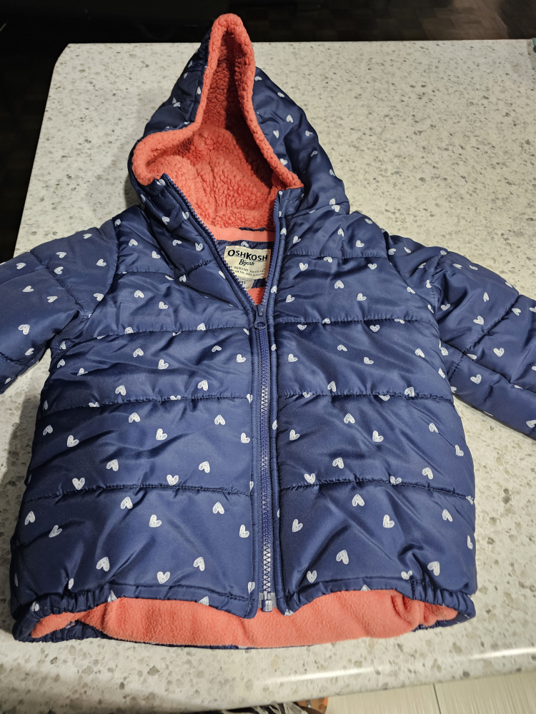 Super cute OshKosh B'gosh puffer jacket for girls! It's a size 4T and features a navy blue exterior with a white heart pattern. The inside is lined with a soft, coral-coloured fleece, making it extra cozy for those cooler days