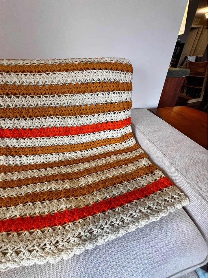 Really nice orange, white, and bronze knitted blanket, either a large throw or smaller bedspread. One small spot (shown in last pic) which was there when I bought it. Feel free to message if you have any questions!