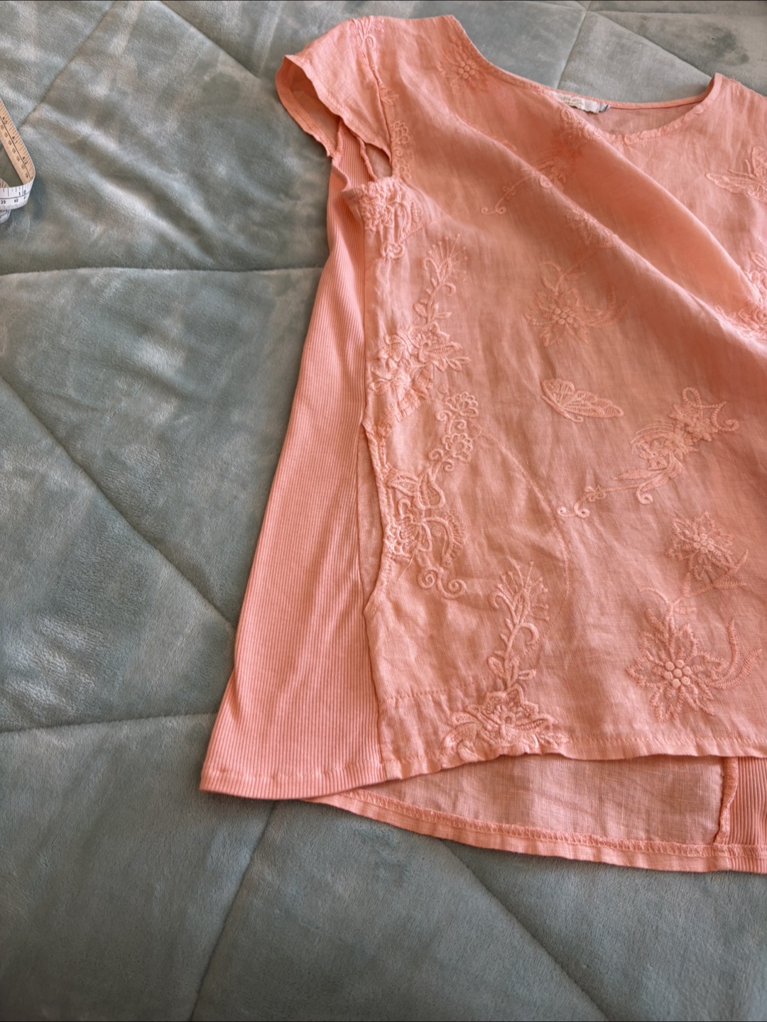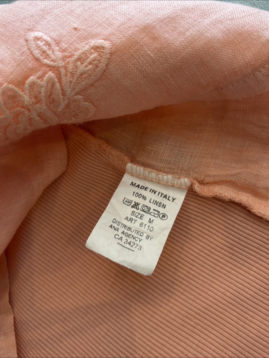 Really pretty light orange/coral top; 100% linen with some stretchy material on the sides which makes it very comfy. It even has pockets! Made in Italy in excellent condition. Size medium