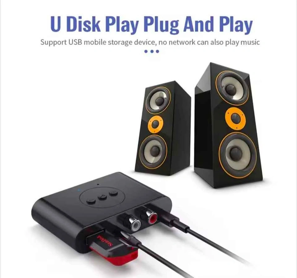 Brand New VAORLO BLS-B21 Bluetooth Audio Receiver. Connects via Bluetooth 5.2 and supports NFC pairing. Features U disk playback and hands-free calling. Output options include 3.5mm AUX and RCA stereo. Comes with a 3.5mm Aux Cable, Type-C Charge Cable, and RCA Cable. Pickup in Hamilton, ON.