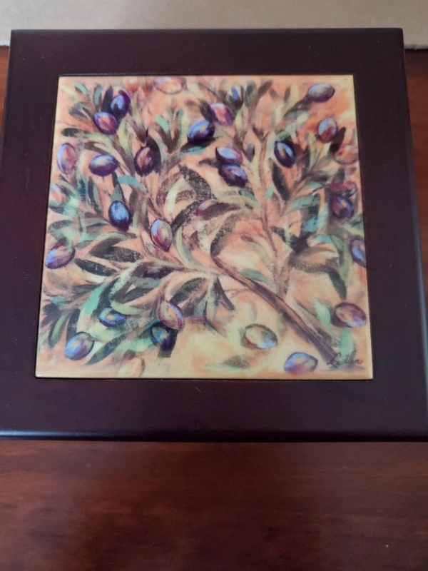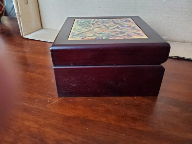 A nice wooden box containing a pair of bottle stoppers. The box has a ceramic tile insert and measures 5.5" x 5.5" -3". Asking $8.00, pick up only.