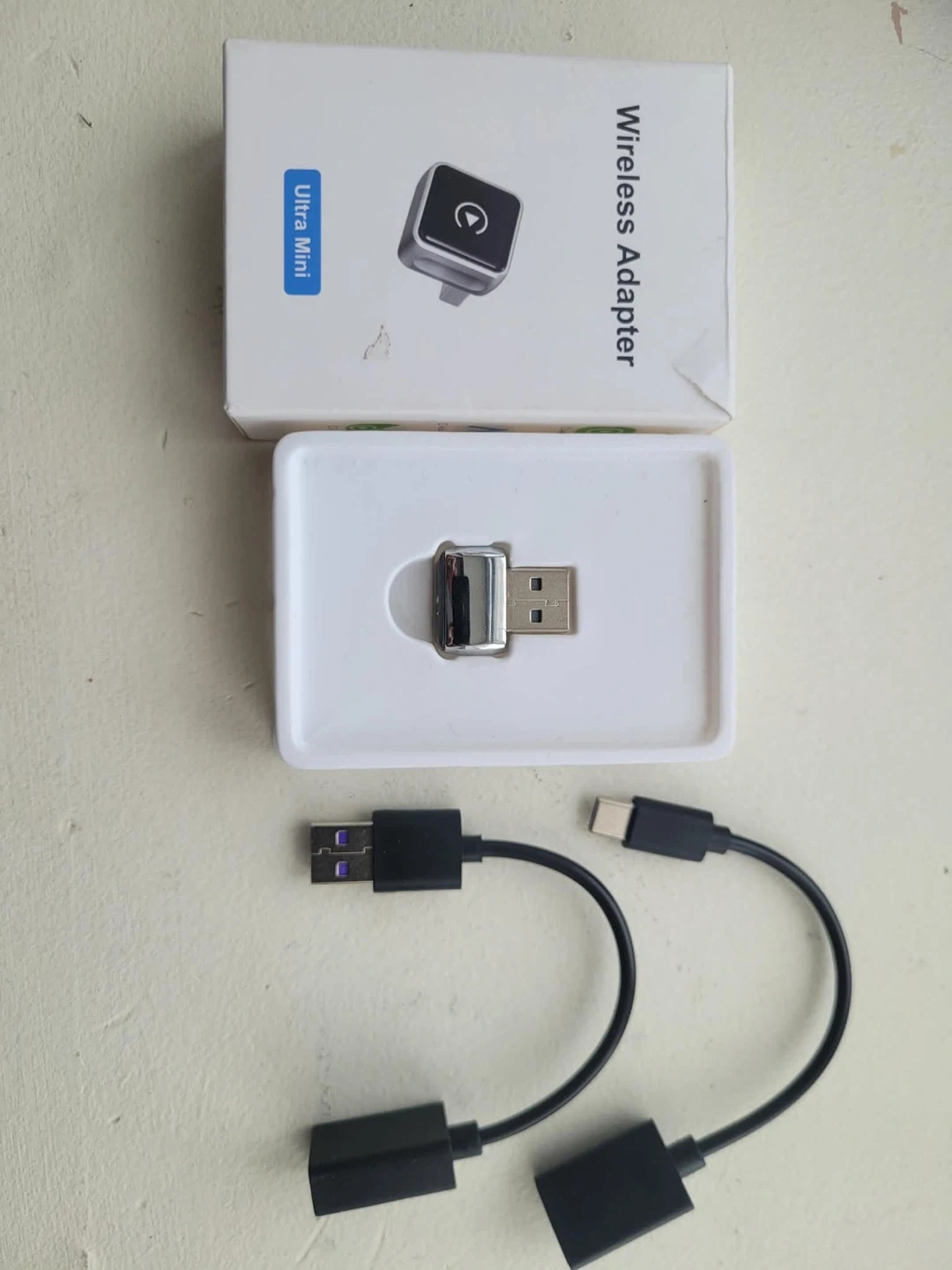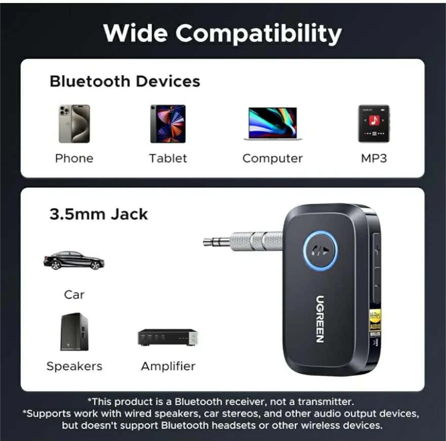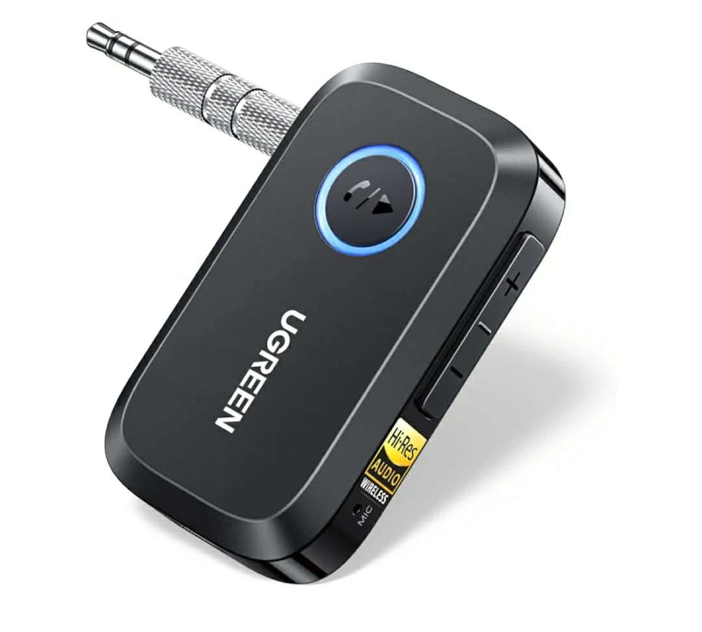 UGREEN Bluetooth 5.0 receiver, perfect for adding wireless audio to your car or speaker system. It's compact and portable, measuring 2.4 inches long and 1.4 inches wide. Supports Hi-Res audio and dual pairing with up to two devices simultaneously. Works with 3.5mm audio inputs and is compatible with phones, tablets, and computers.