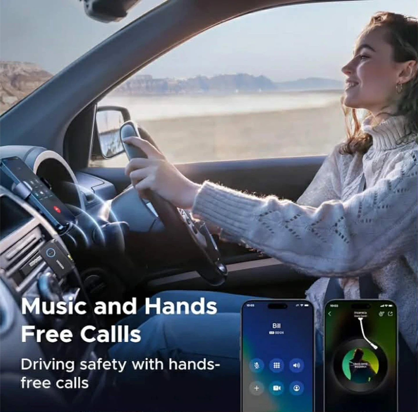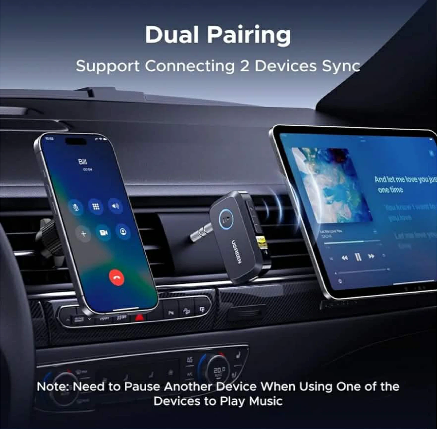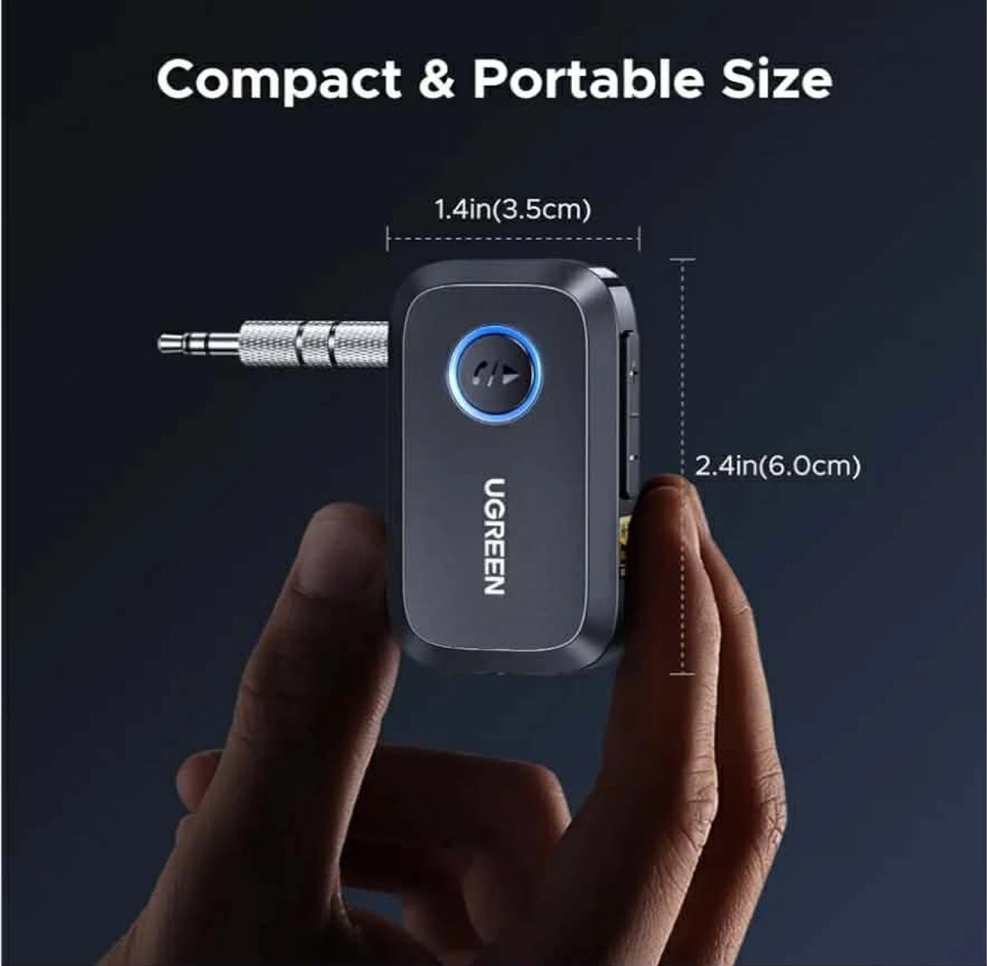 UGREEN Bluetooth 5.0 receiver, perfect for adding wireless audio to your car or speaker system. It's compact and portable, measuring 2.4 inches long and 1.4 inches wide. Supports Hi-Res audio and dual pairing with up to two devices simultaneously. Works with 3.5mm audio inputs and is compatible with phones, tablets, and computers.