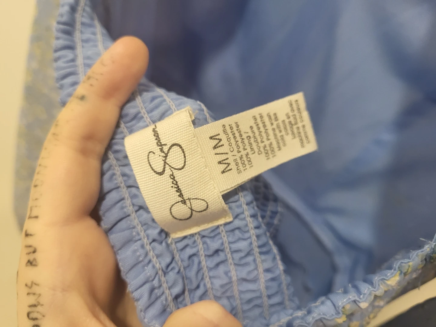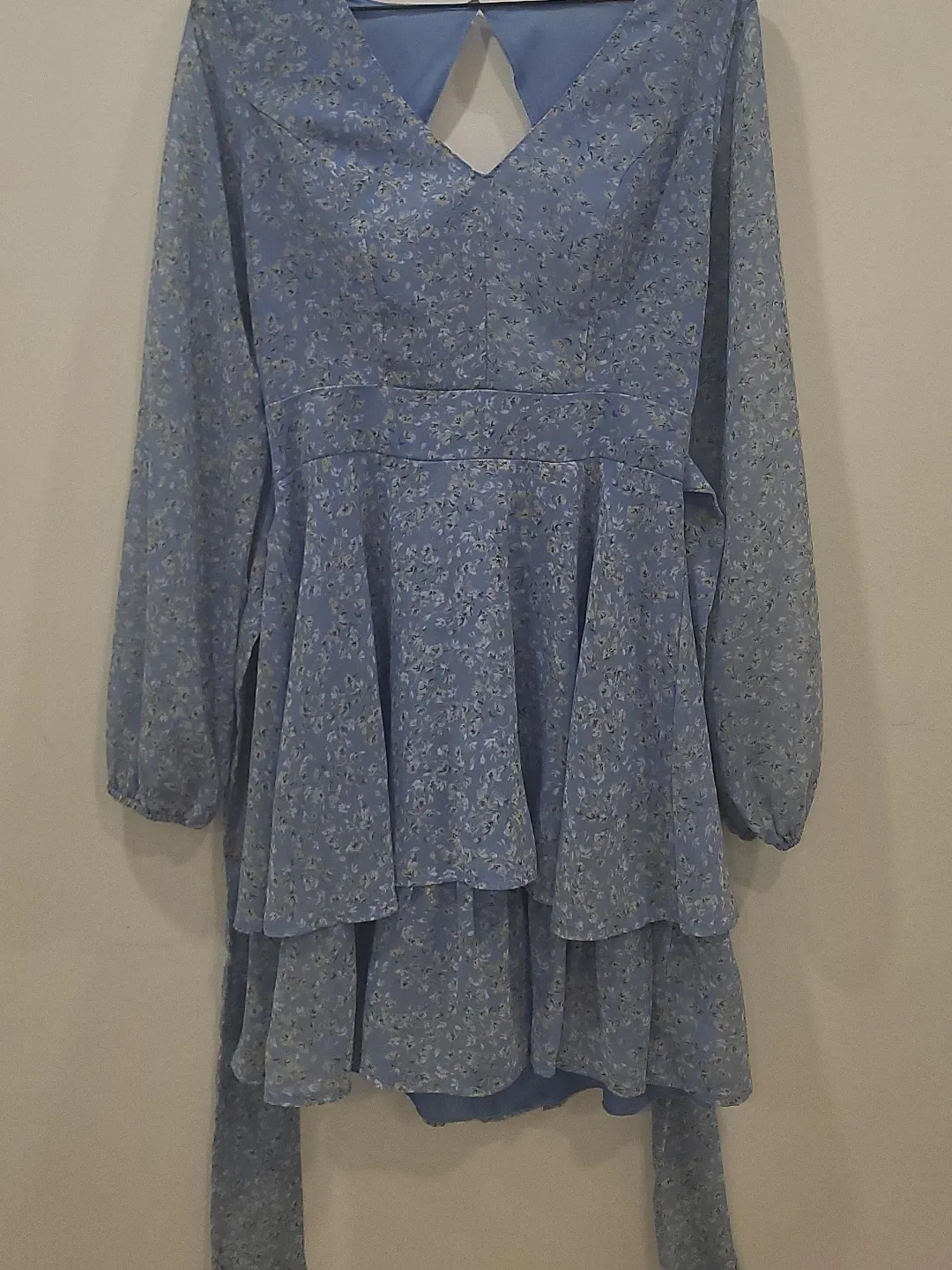 Selling a cute blue dress with a floral print! It has long sleeves and a tiered skirt. The back has a small opening and a button closure. Perfect for spring or summer!