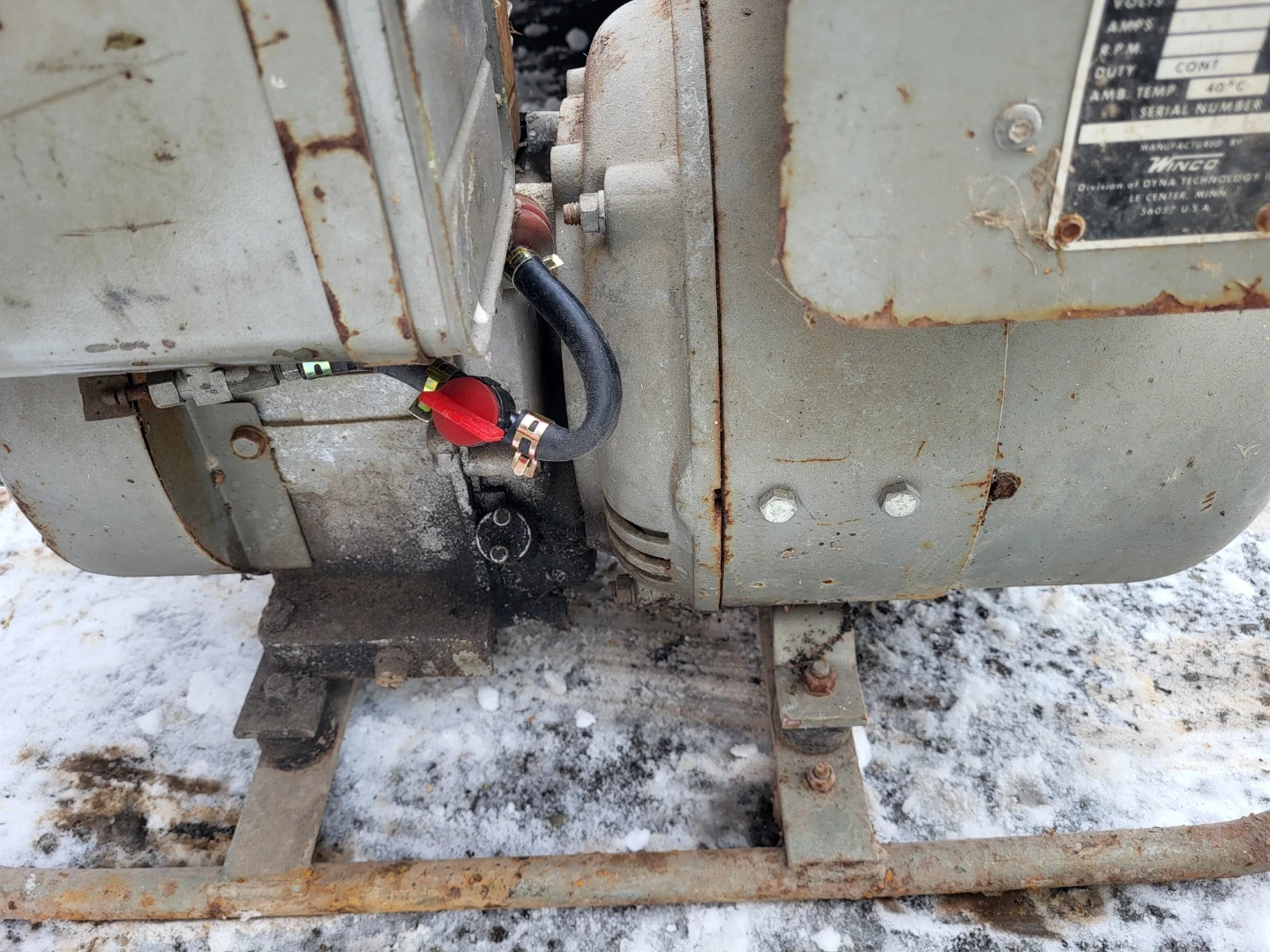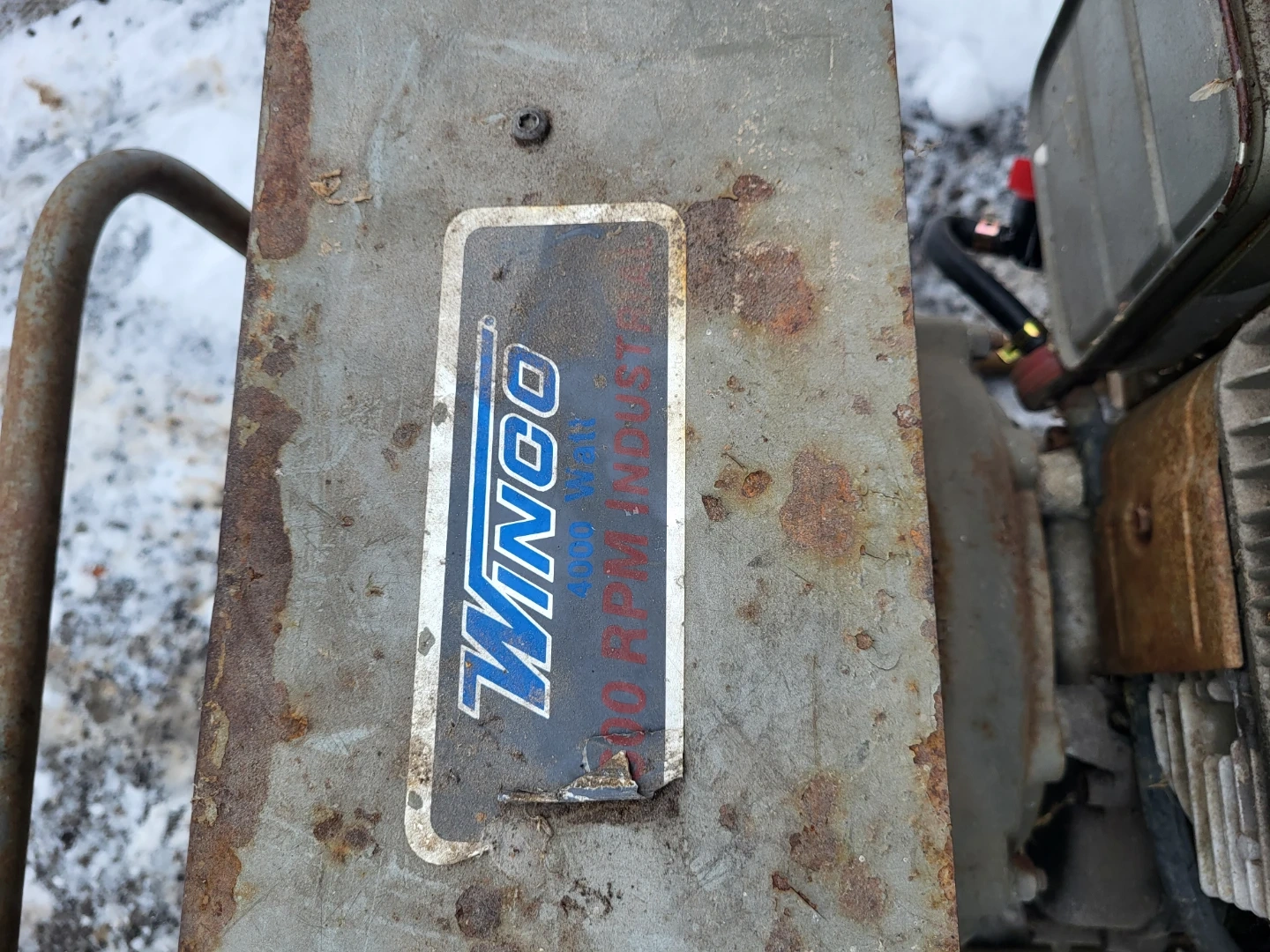 This is a Winco 4000 Watt generator with a Briggs & Stratton 319cc engine. It's rated for 115 V and 3500 RPM. Runs, and needs new air filter. Choke is very sensitive.
