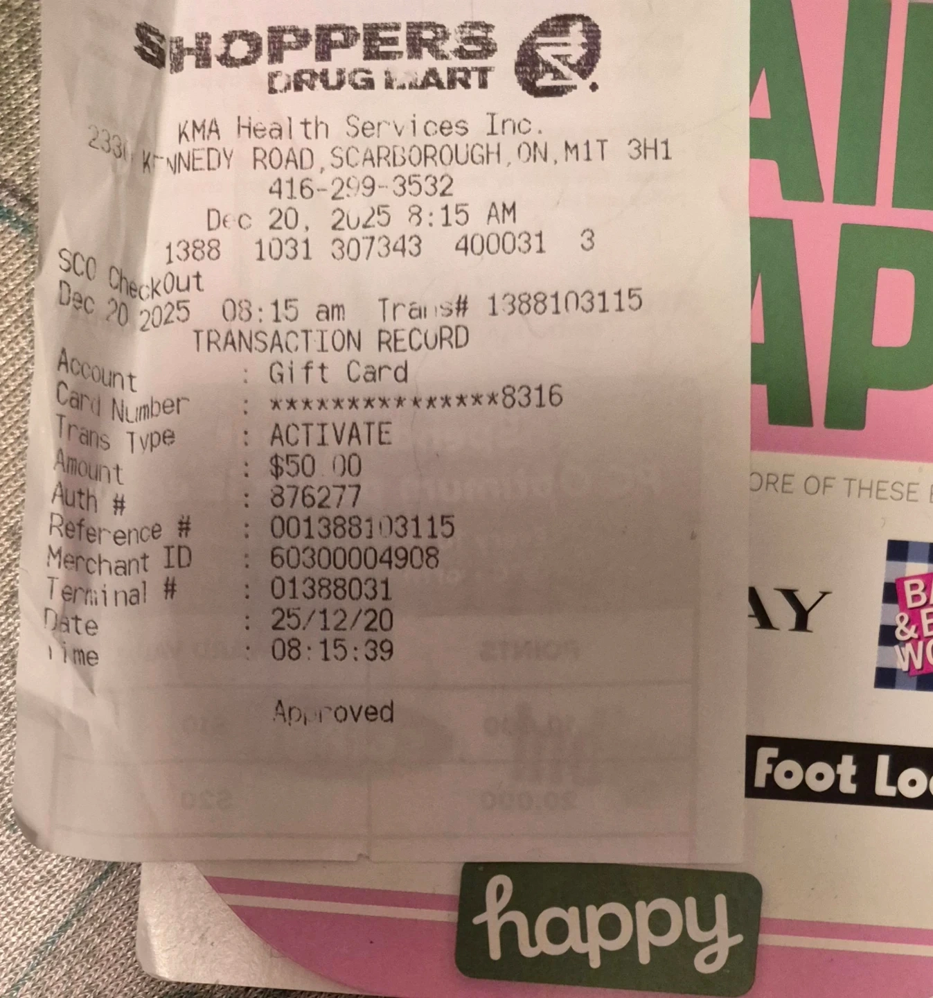 This is a $50 Shoppers Drug Mart gift card. It can be used for egifts from various brands. This card has an expiry date of December 20, 2025.