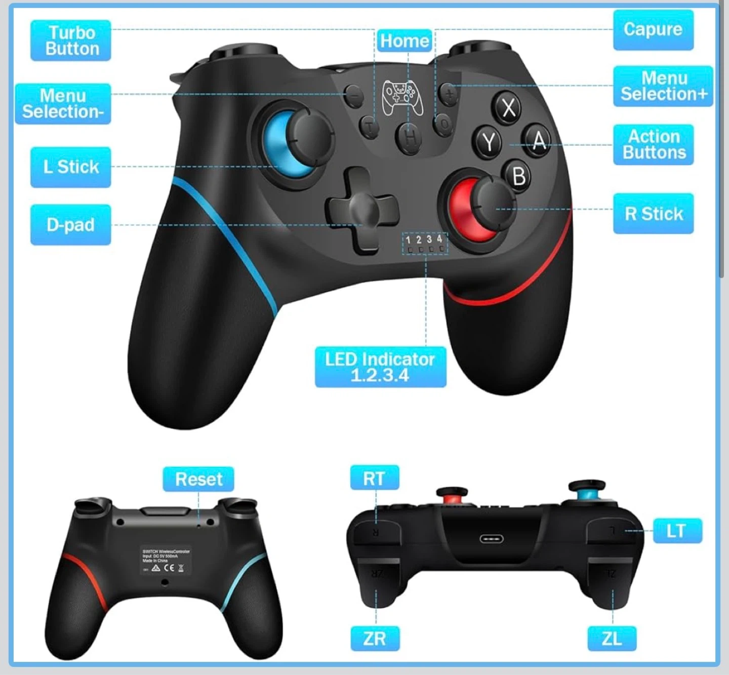Zakgbxbig wireless Pro Controller for Nintendo Switch. It's black and features a 360° 3D joystick and turbo function. Offers 6-8 hours of working time on a single charge. Dual vibration for an immersive gaming experience!