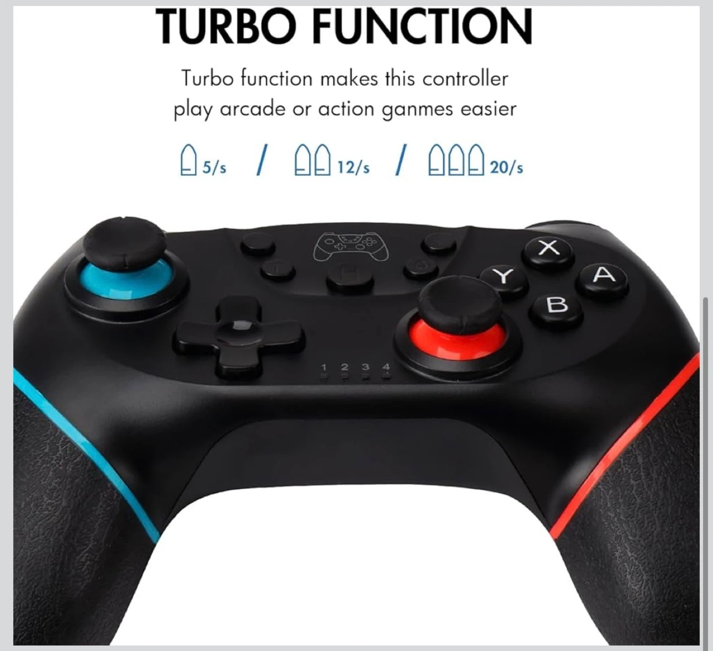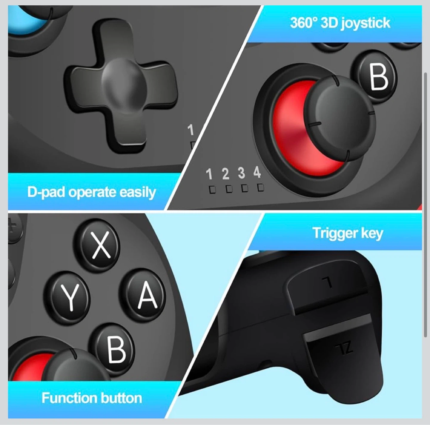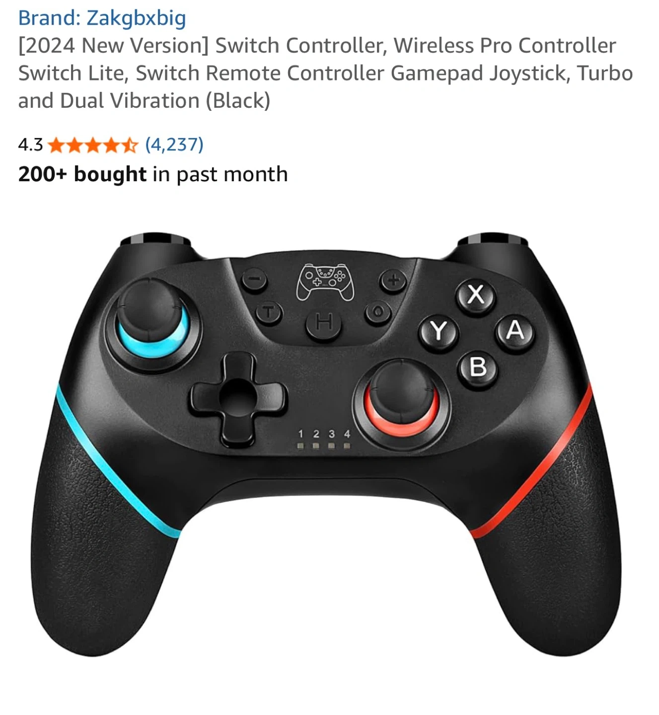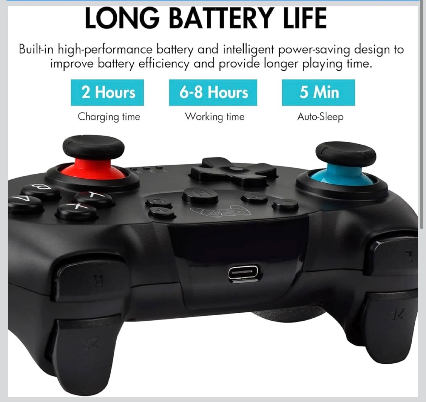 Zakgbxbig wireless Pro Controller for Nintendo Switch. It's black and features a 360° 3D joystick and turbo function. Offers 6-8 hours of working time on a single charge. Dual vibration for an immersive gaming experience!